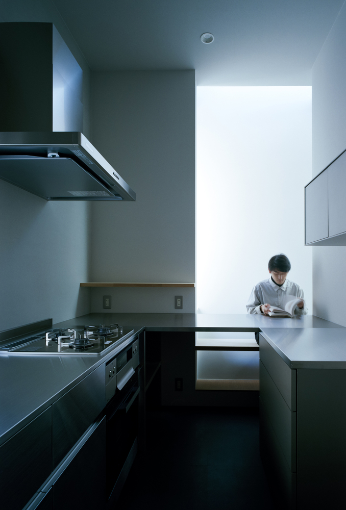 In the interior, we chose light colors to reflect light off the wall and used gray for the other walls to distinguish them from the slanted wall.