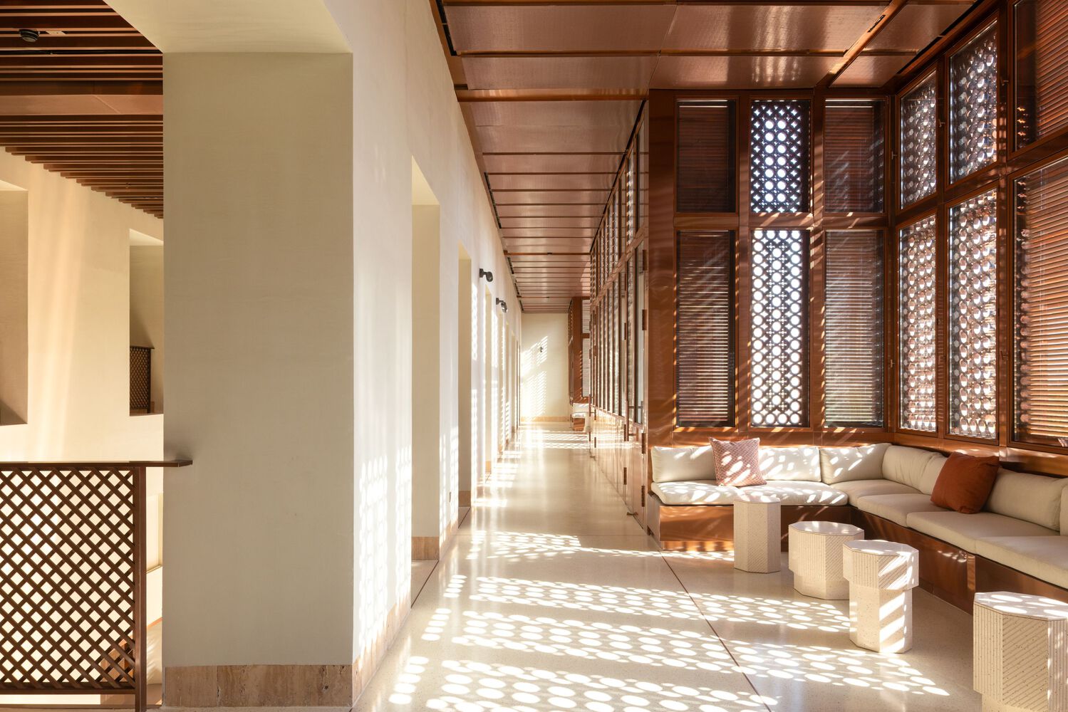 Inside, the roshans unfold in copper, giving the interiors a warm, futuristic glow. The metal surfaces catch and diffuse the natural light, transforming the texture of the spaces throughout the day.