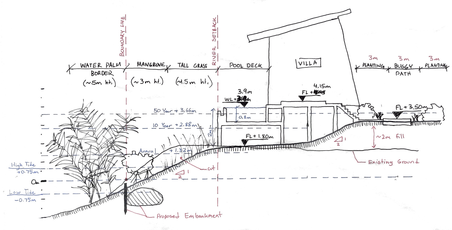 In a region with frequent flooding, the "Sanctuary" concept extends to the master plan, integrating sustainability as both principle and practice with actions such as soil preservation, water conservation, and local planting strategies that foster ecological resilience.
