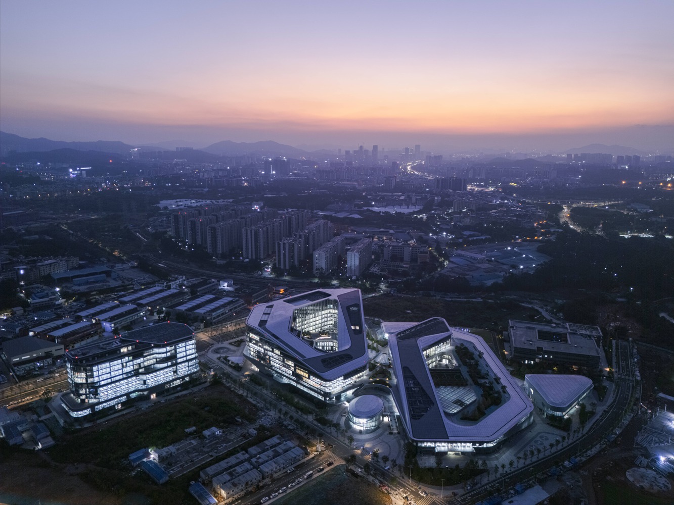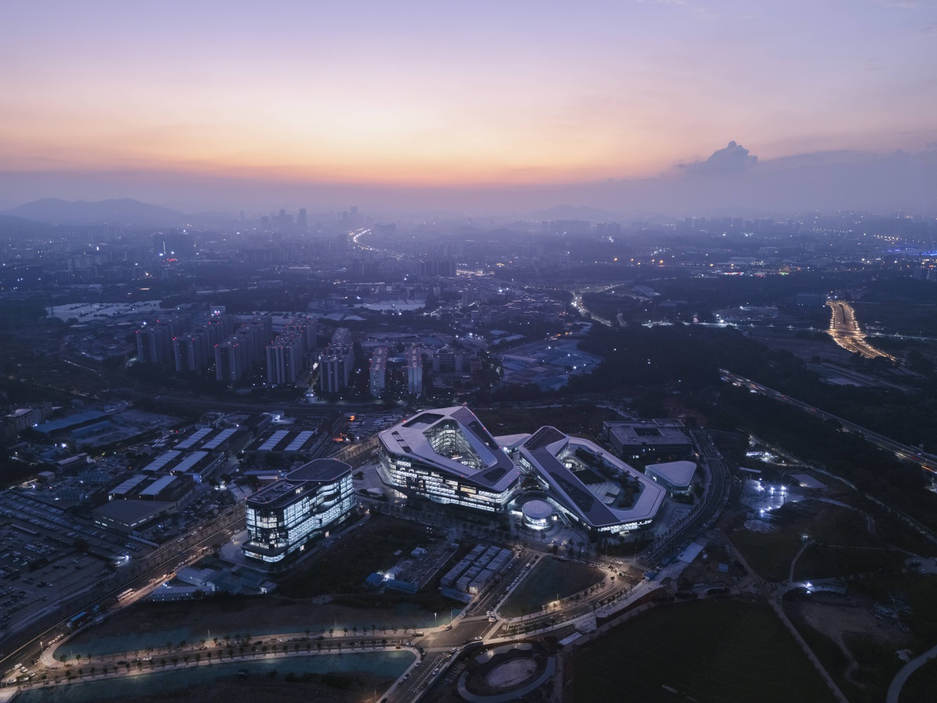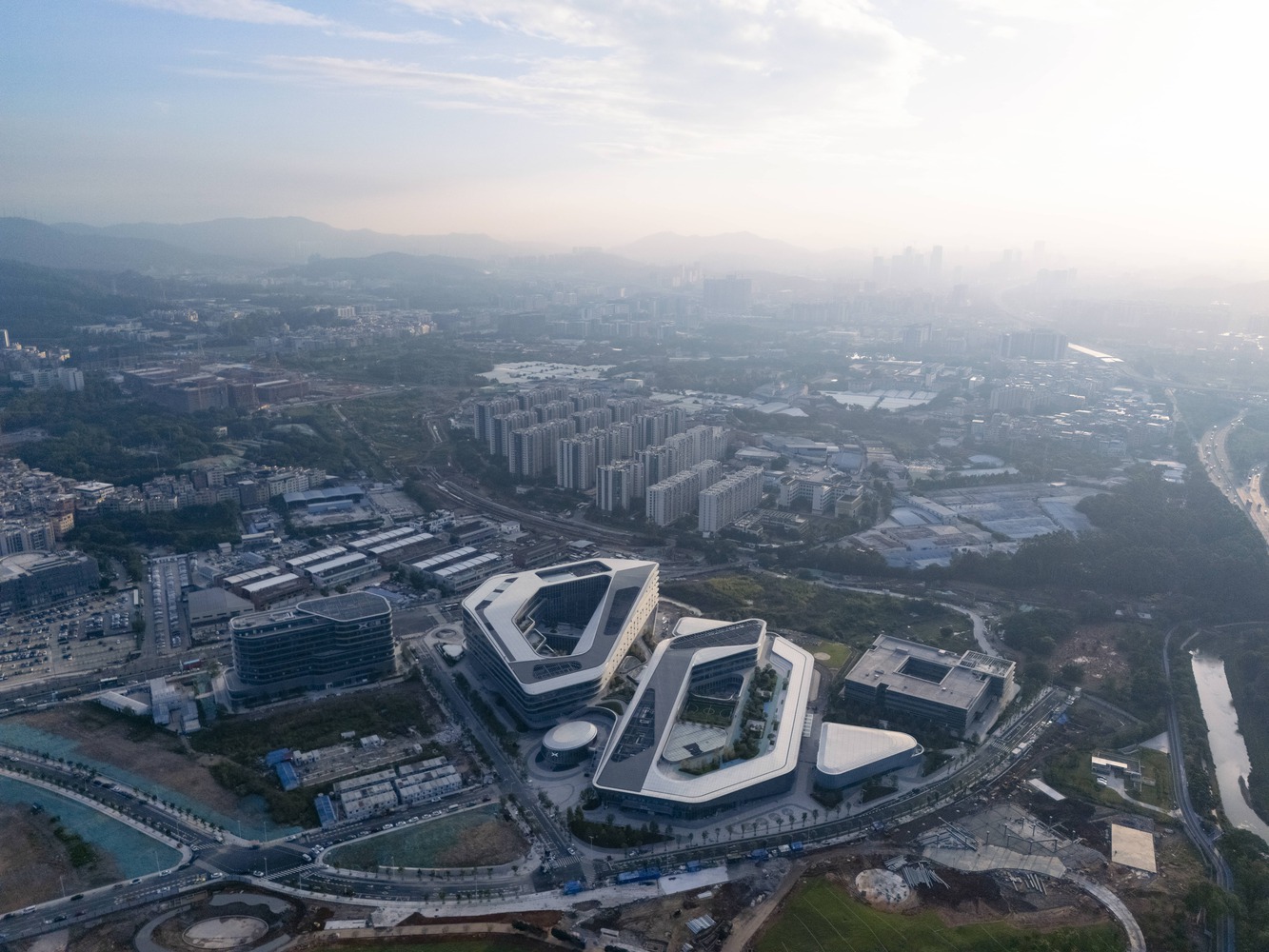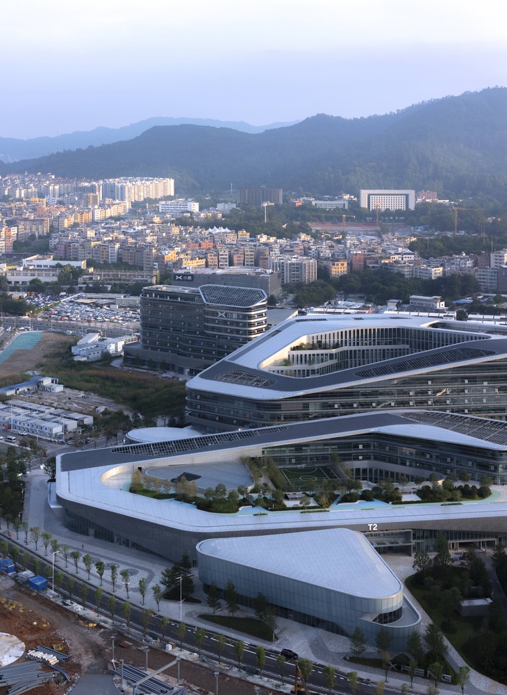 It encompasses the headquarters for both XPENG Motors and AeroHT (XPENG's flying car division), forming a contemporary technology park that integrates AI intelligent technology, green and low-carbon initiatives, and architectural aesthetics.