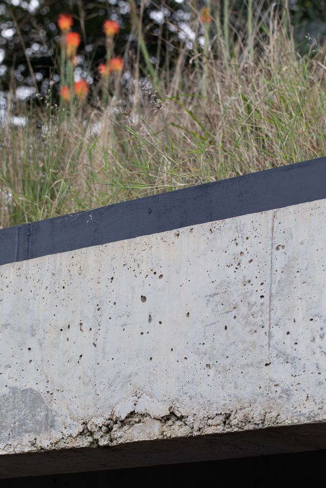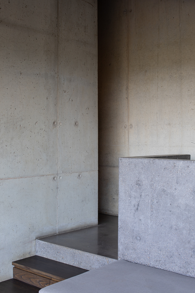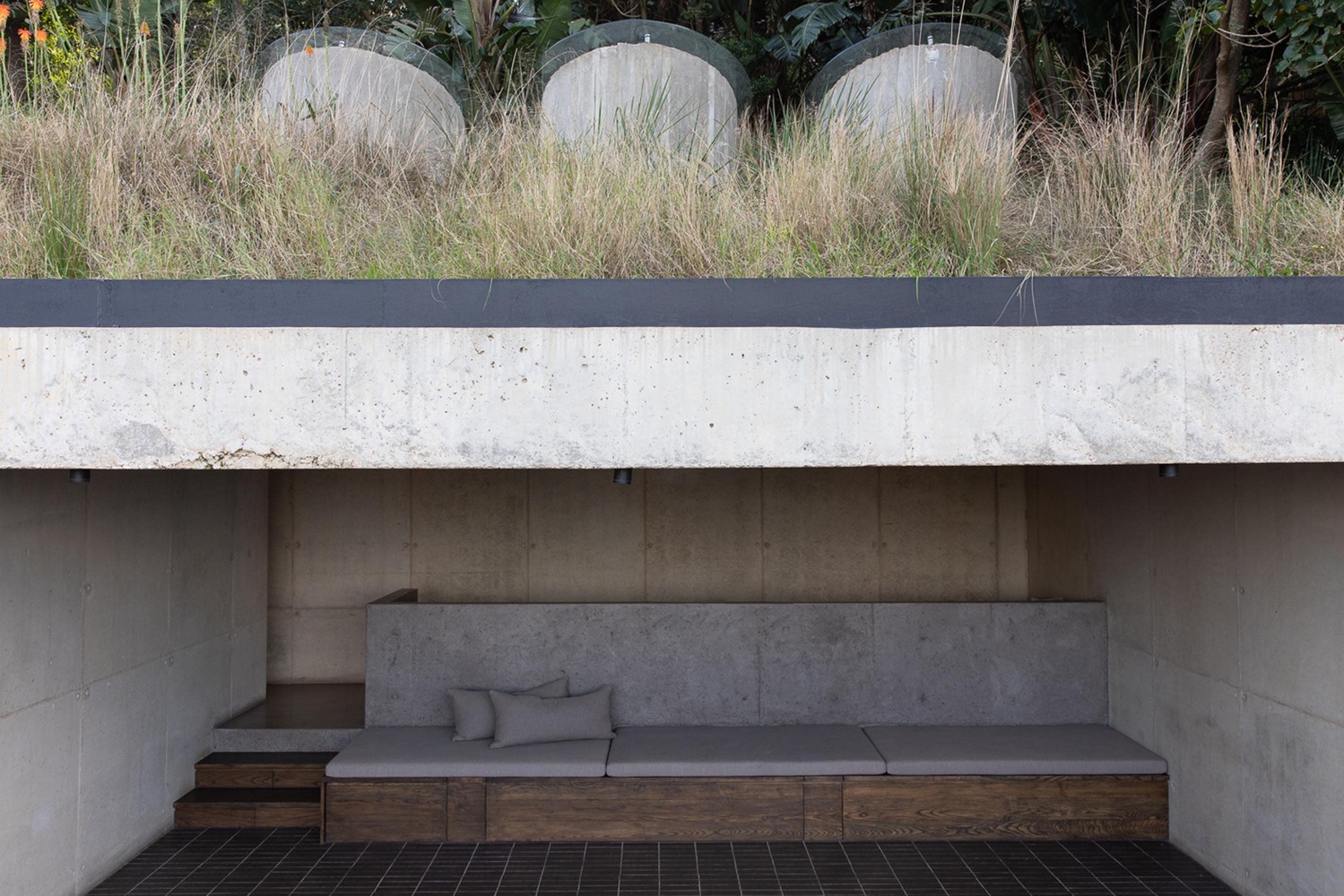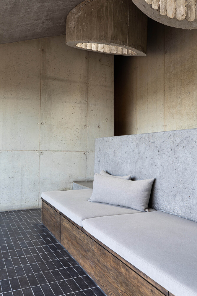 From the main house, only the tops of its cast-in-situ concrete skylights are visible. Light filters into the interior from above, creating a quiet, luminous atmosphere within.