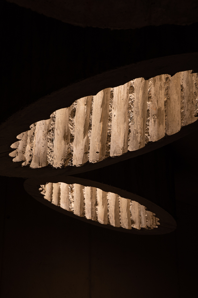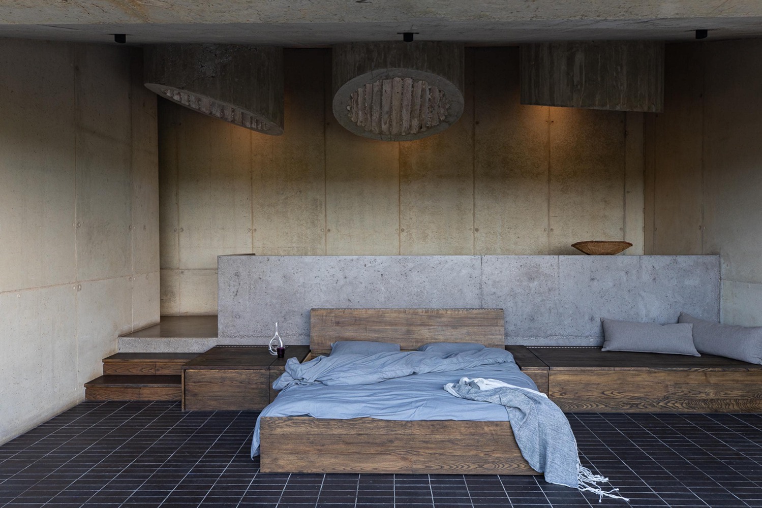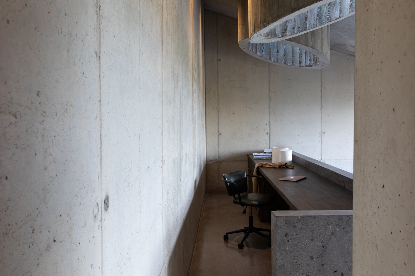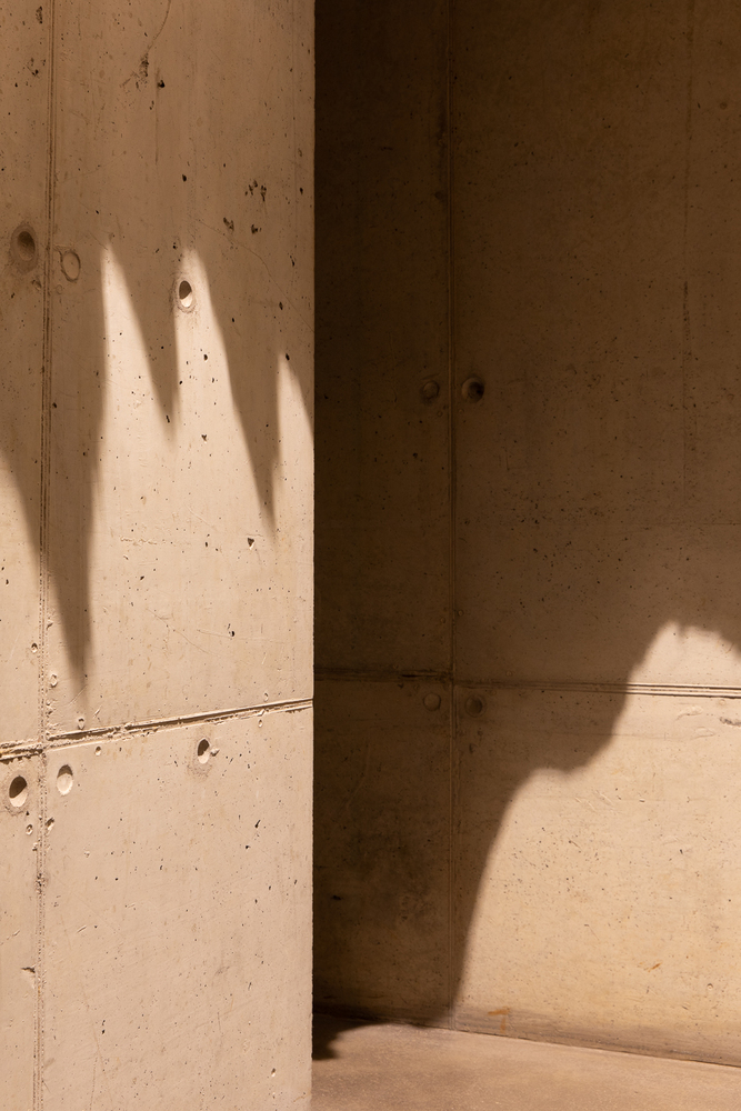 From the main house, only the tops of its cast-in-situ concrete skylights are visible. Light filters into the interior from above, creating a quiet, luminous atmosphere within.