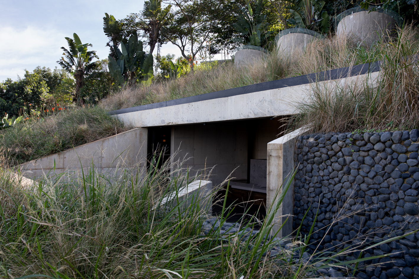 The structure is largely hidden—built into the hillside without a driveway or formal entry, and accessed on foot.