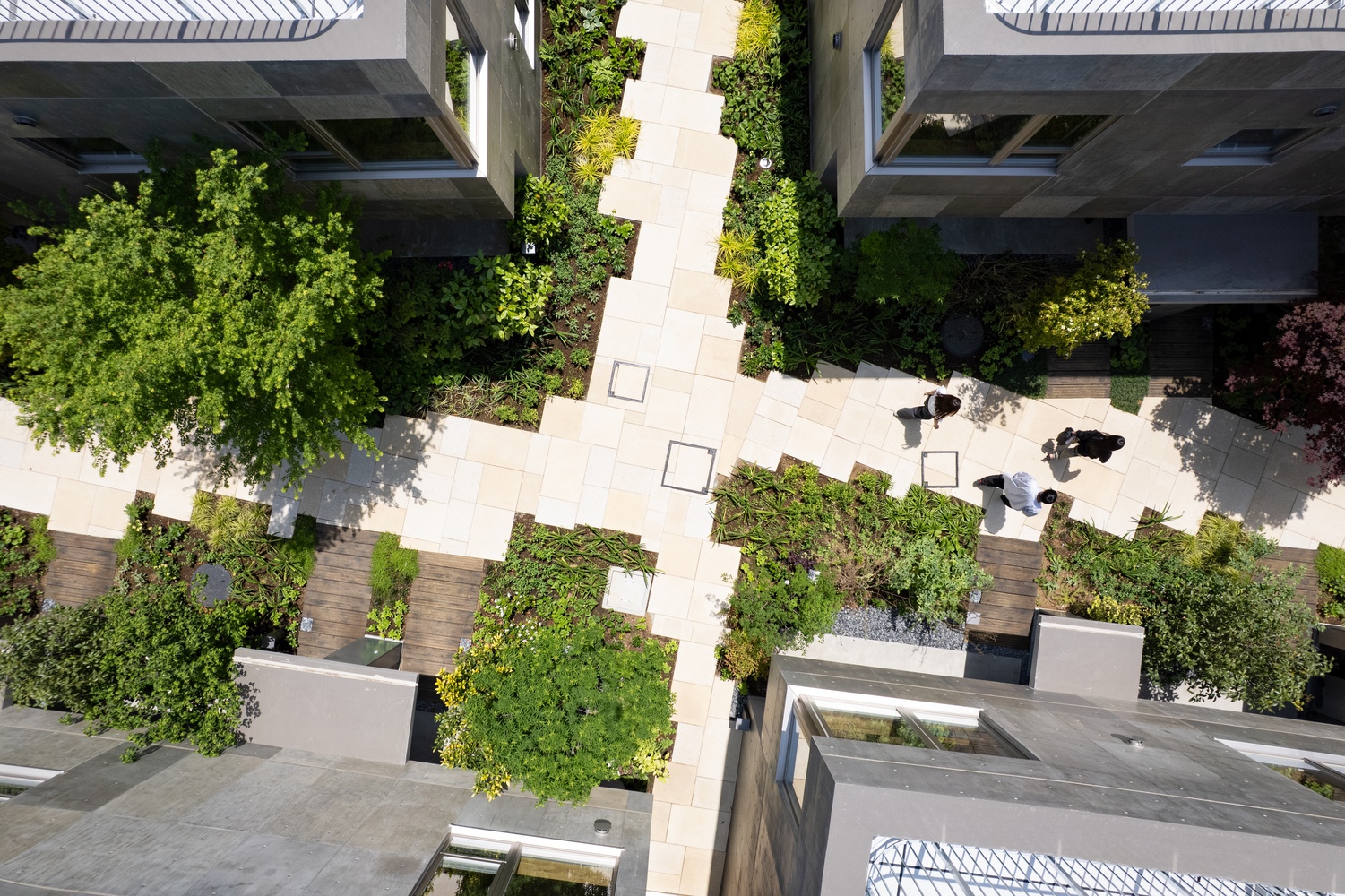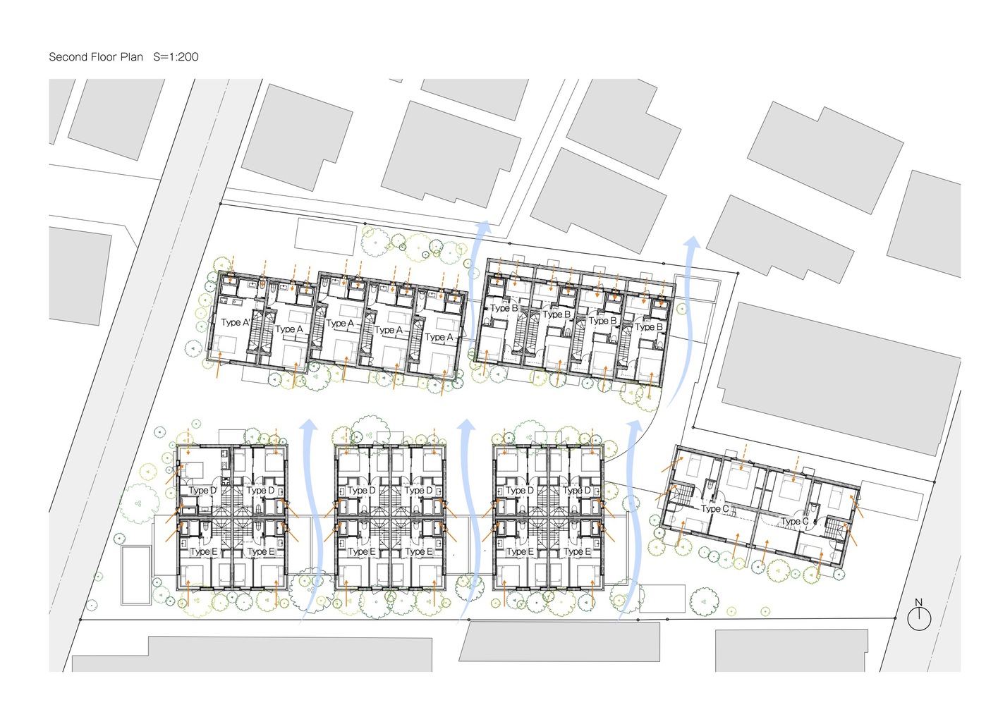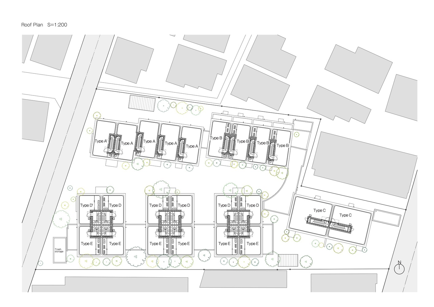 Twenty-three row houses are connected as one continuous building, yet a narrow path runs east–west through the site, creating permeability and a quiet sense of shared ground.
