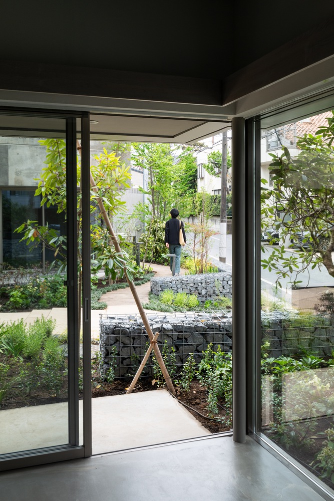 On the first floor, the living-dining areas were carefully designed to mediate between interior life and the garden path that runs through the site, using layers of planting, mounds, and eaves to maintain a gentle balance between connection and privacy.