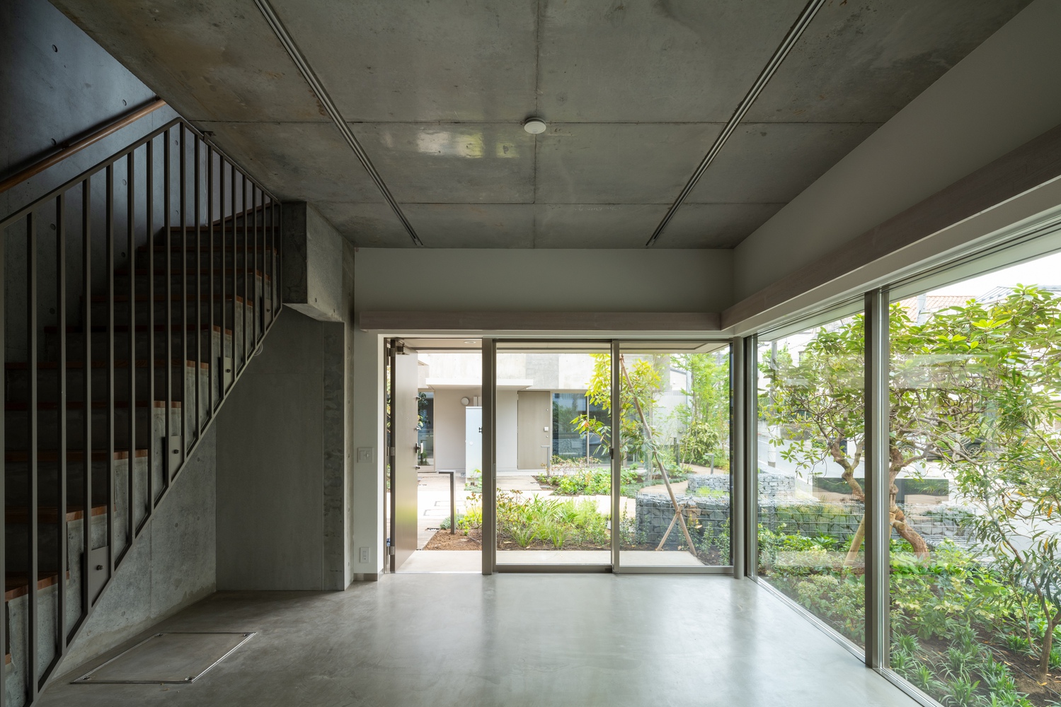 This cluster of row houses is located about ten minutes on foot from Nishi-Ogikubo Station in a quiet residential area of Suginami, Tokyo, within a neighborhood of detached homes.