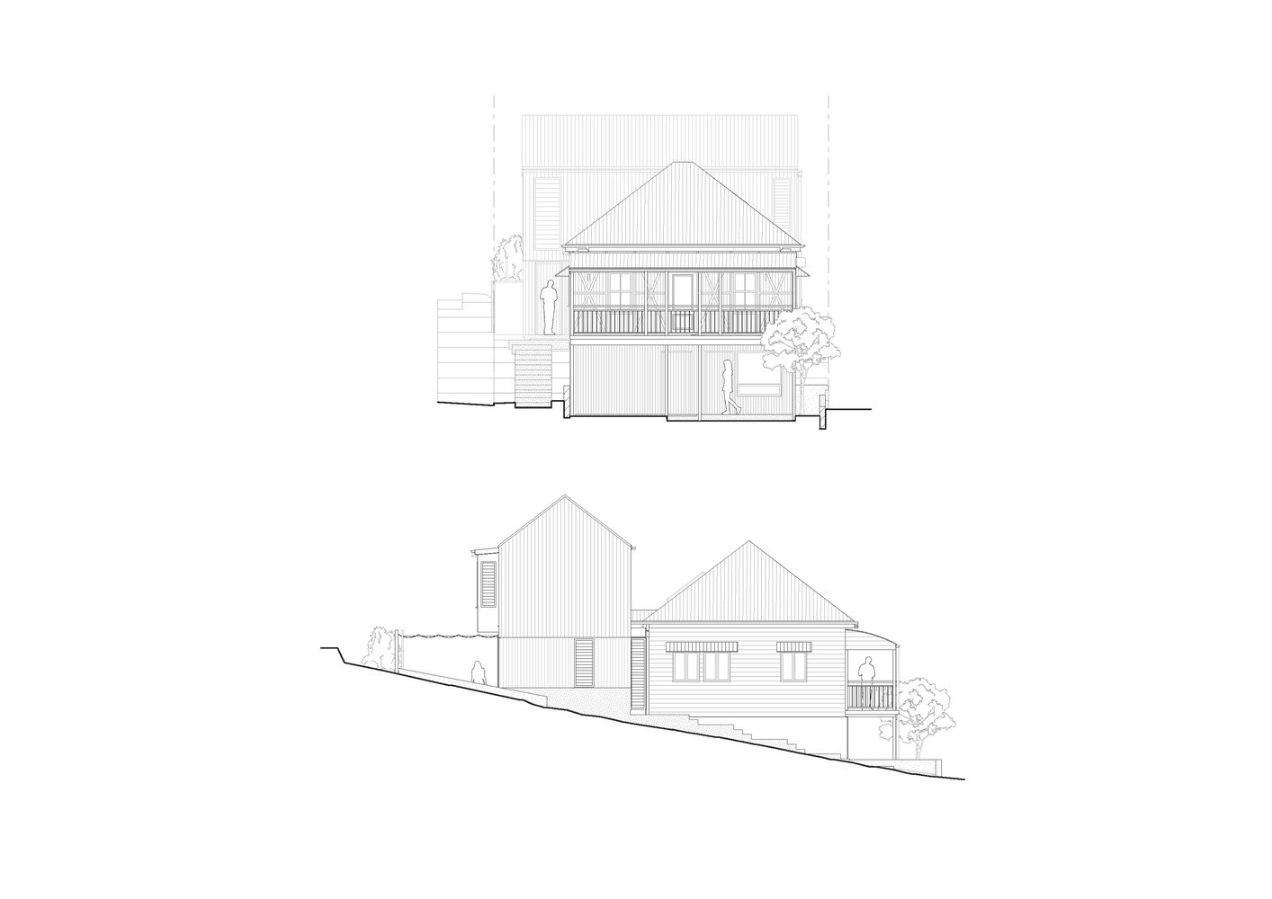 The reconfigured cottage accommodates bedrooms and a discreet secondary dwelling beneath, while the contemporary rear addition houses the kitchen and living spaces, capped by a lofted parents' retreat.