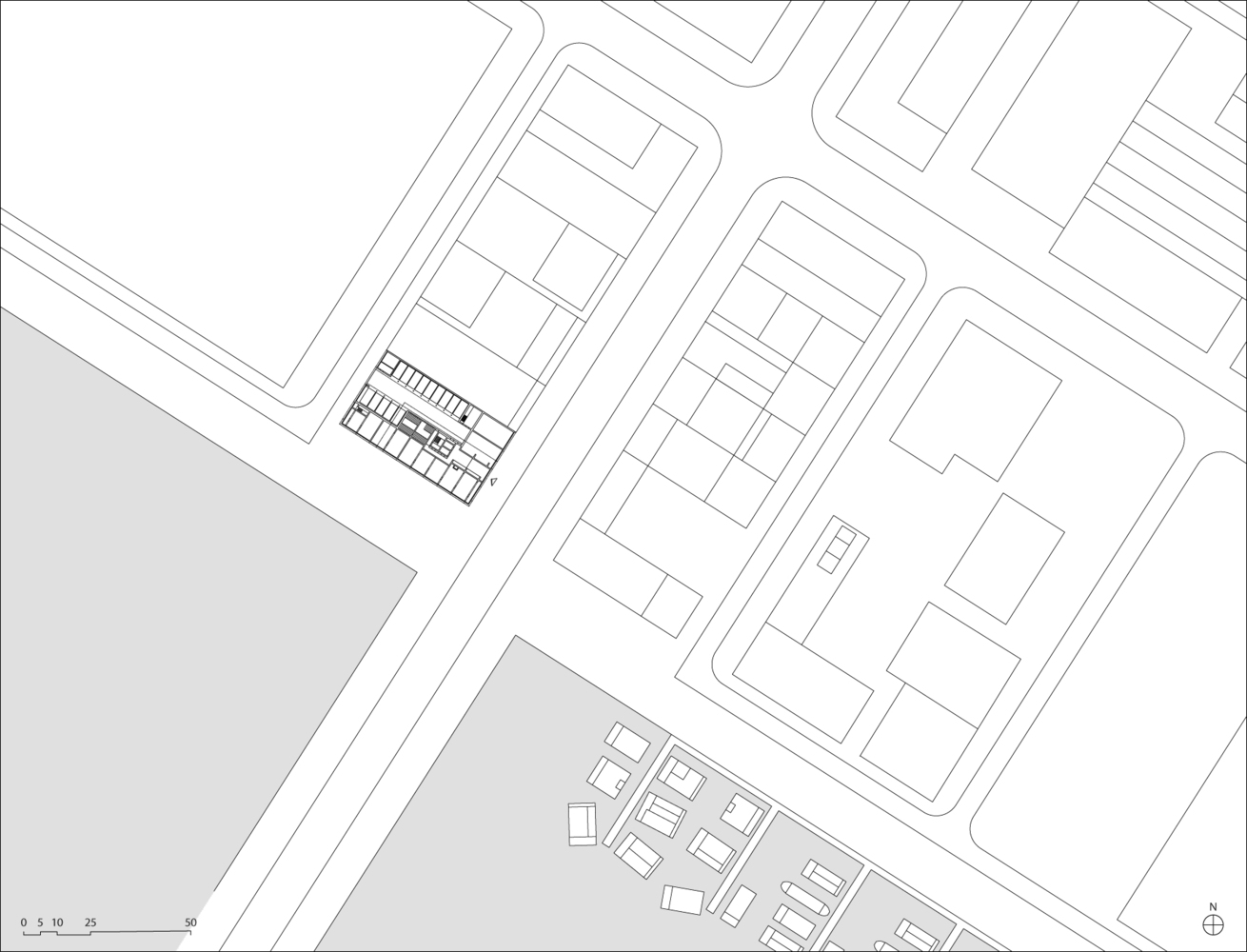 Located in the exposed post-industrial former harbor area of Buiksloterham, Amsterdam-Noord, the building comprises, in its current configuration, 29 apartments including work-living units, a shared area with gym, sauna kitchen and an outdoor urban farming, 6 commercial premises, a shared area on the third floor (gym, sauna, and collective kitchen, connected to the outdoor urban farming), and a parking garage.