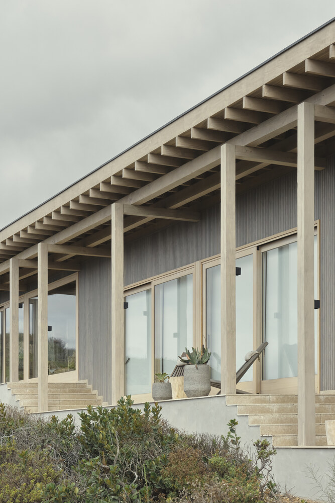 It mainly consists of laminated wood beams resting on 6"x6" pillars where the main, secondary, and lateral beams are exposed, giving a dynamic texture and rhythm to its facades.