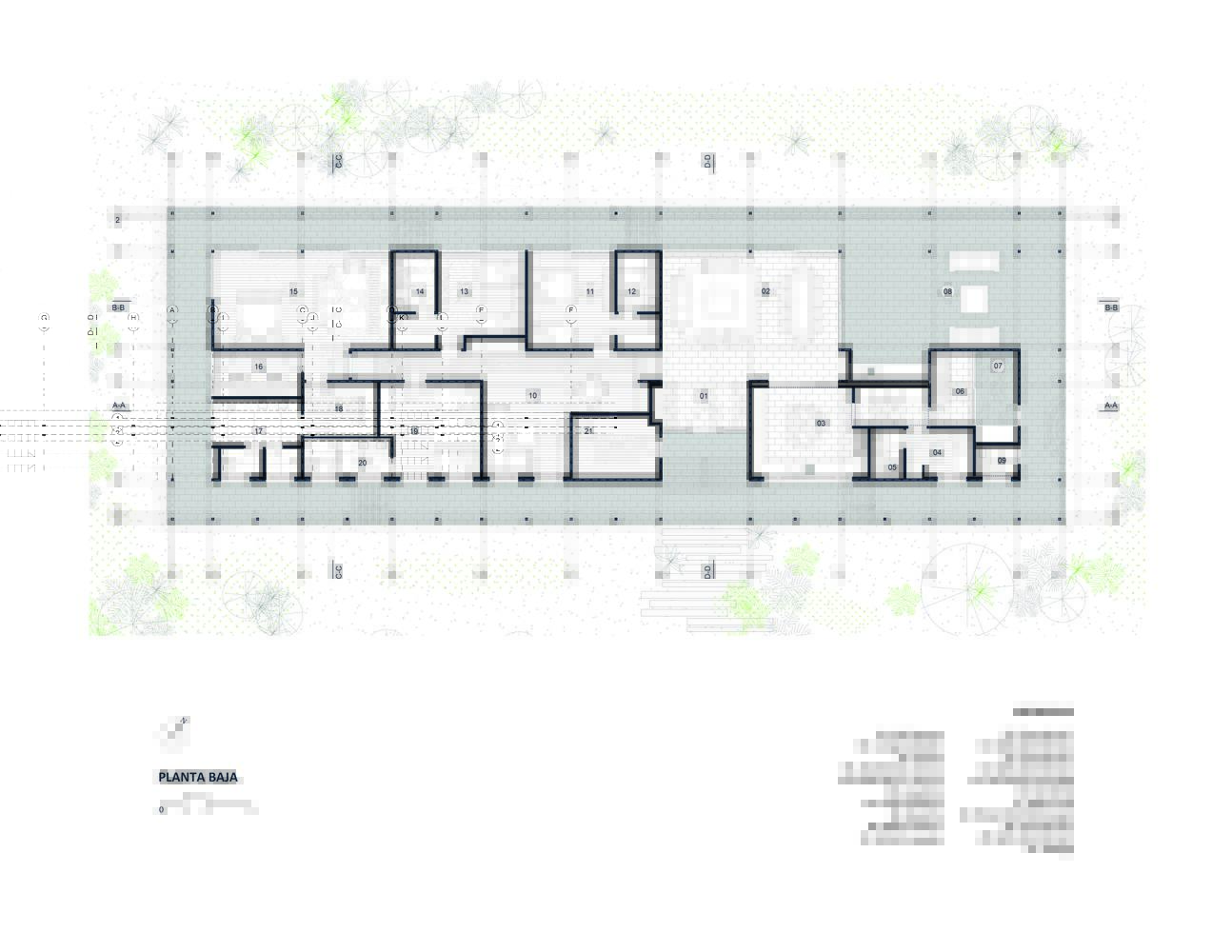 To this end, a curved roof was proposed that interacts with the slope of the hill, generating a new spatial quality. Additionally, a proposal for peripheral corridors on three levels was developed to allow for a connection with the local flora.