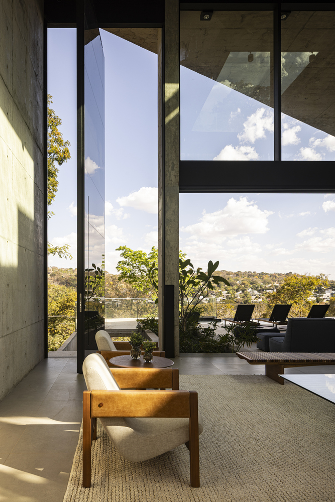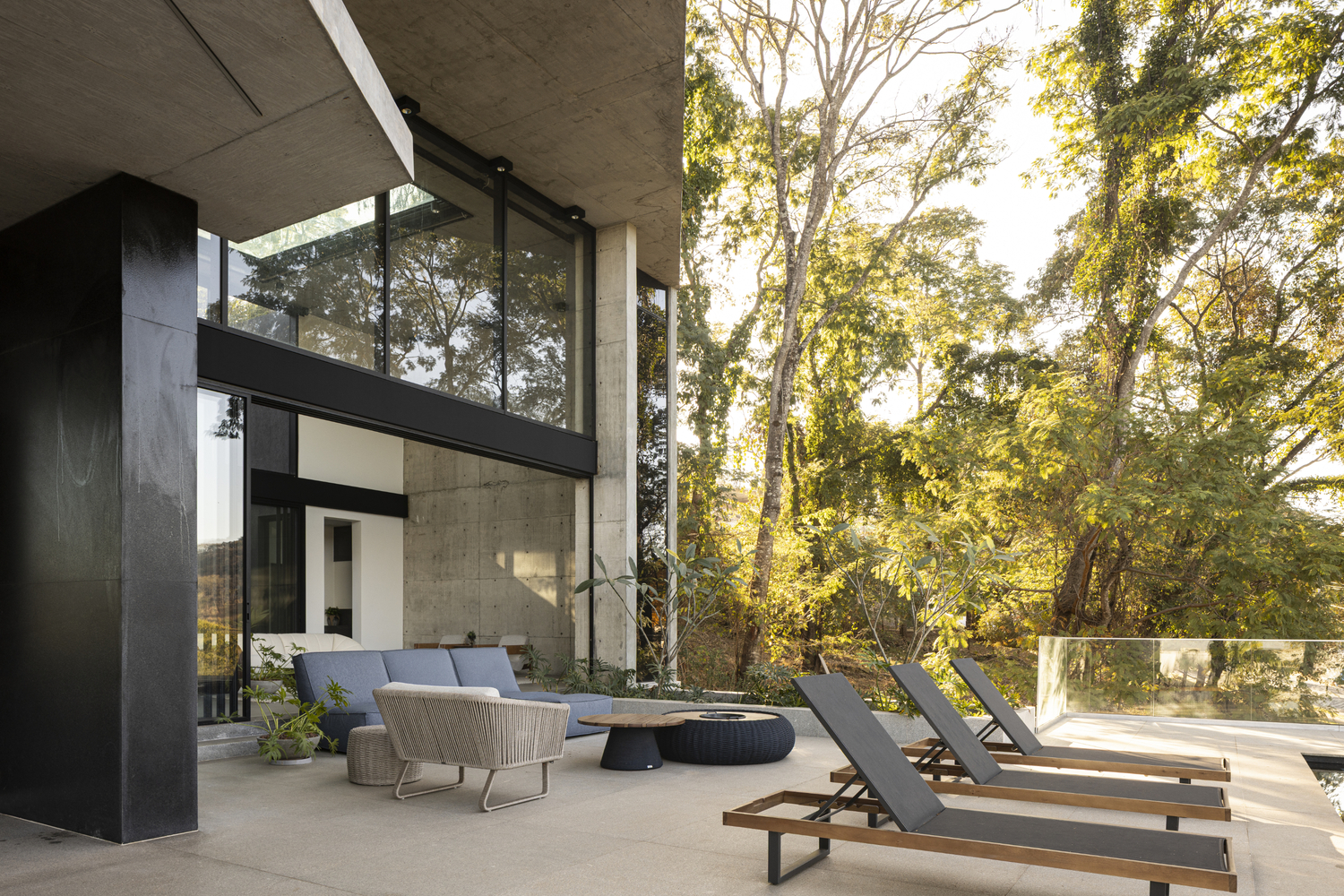 The cantilevered roof extends over the social spaces, acting as a sun protection element and an extension of the architecture over the land.