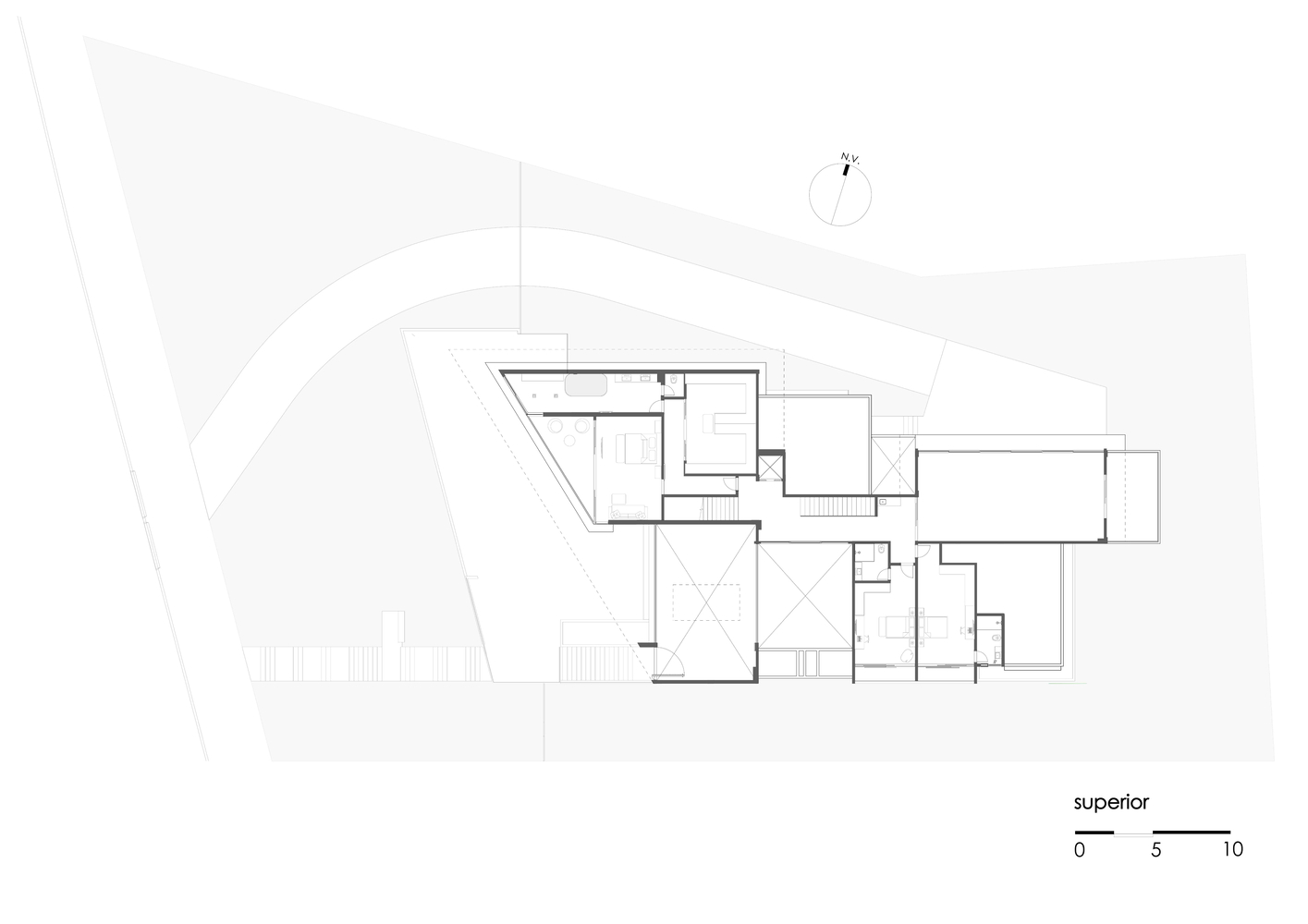 The upper floor contains the intimate spaces, organized in a more enclosed and elevated volume, with strategic openings facing the landscape.