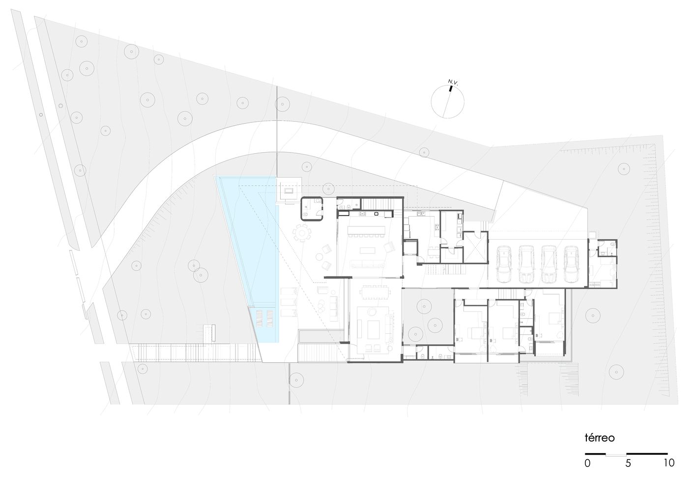 Set on a sharply sloped lot in the Aldeia do Vale Condominium in Goiânia (GO), this residence is part of an occupancy strategy that aims to adapt to the natural topography, reducing land cuts and exploring the possibilities of the elevation to distribute the program.