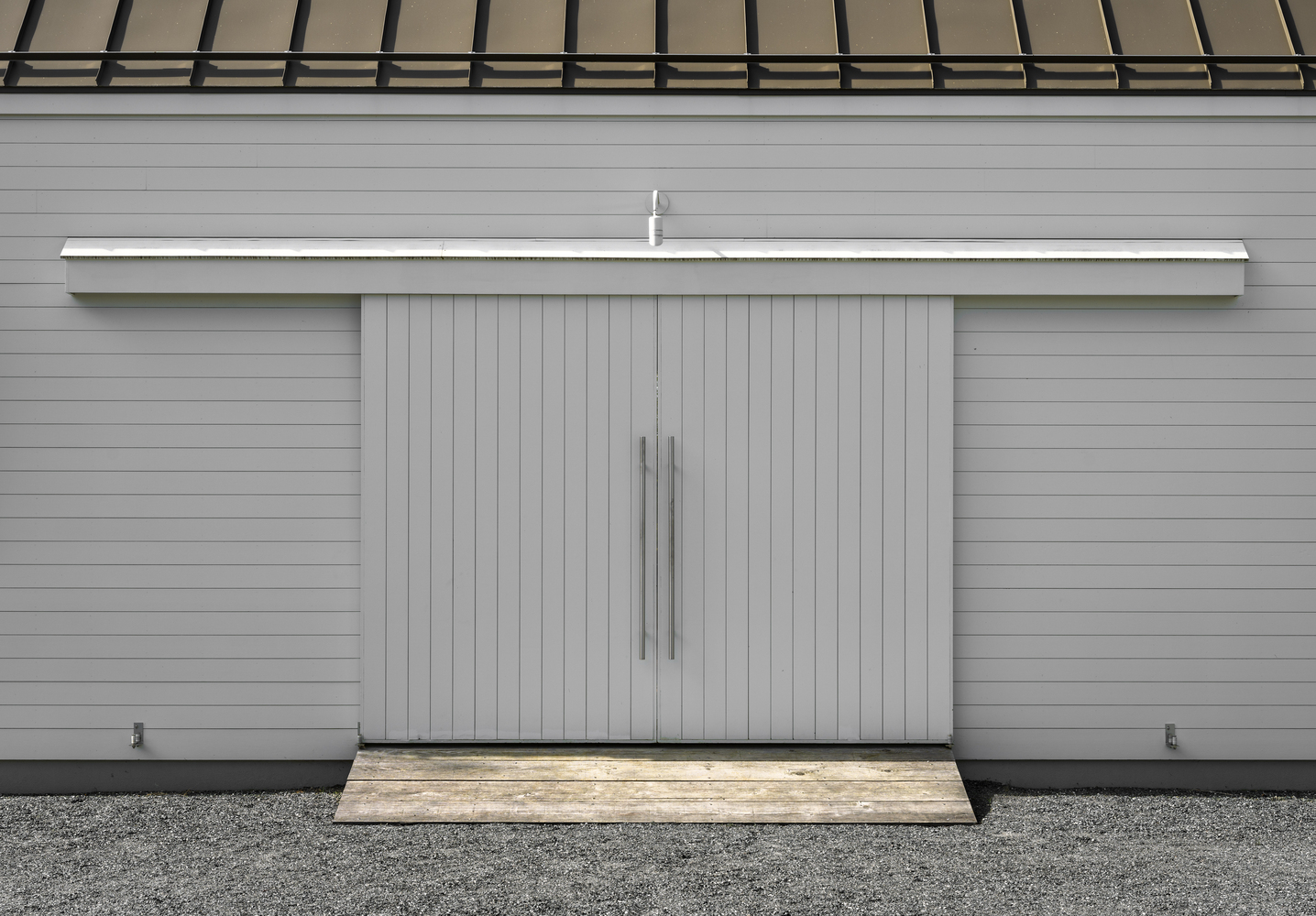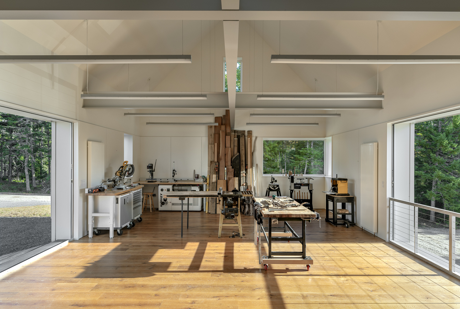 The metal shop tucks into the bank below, while the woodshop is located on the upper level with large openings to the east and west. These incisions provide cross ventilation while sliding barn doors modulate daylight.