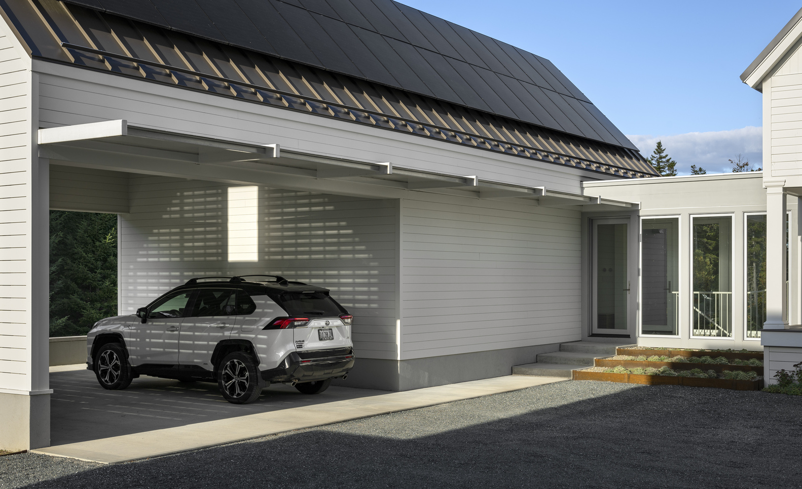 A carport attached to the studio is shaded by an open-joint rainscreen that acts as a two-way light screen.
