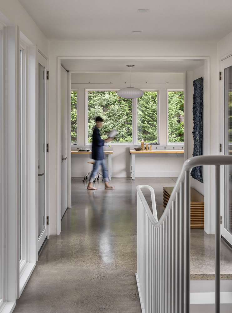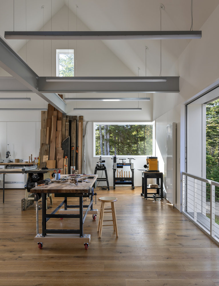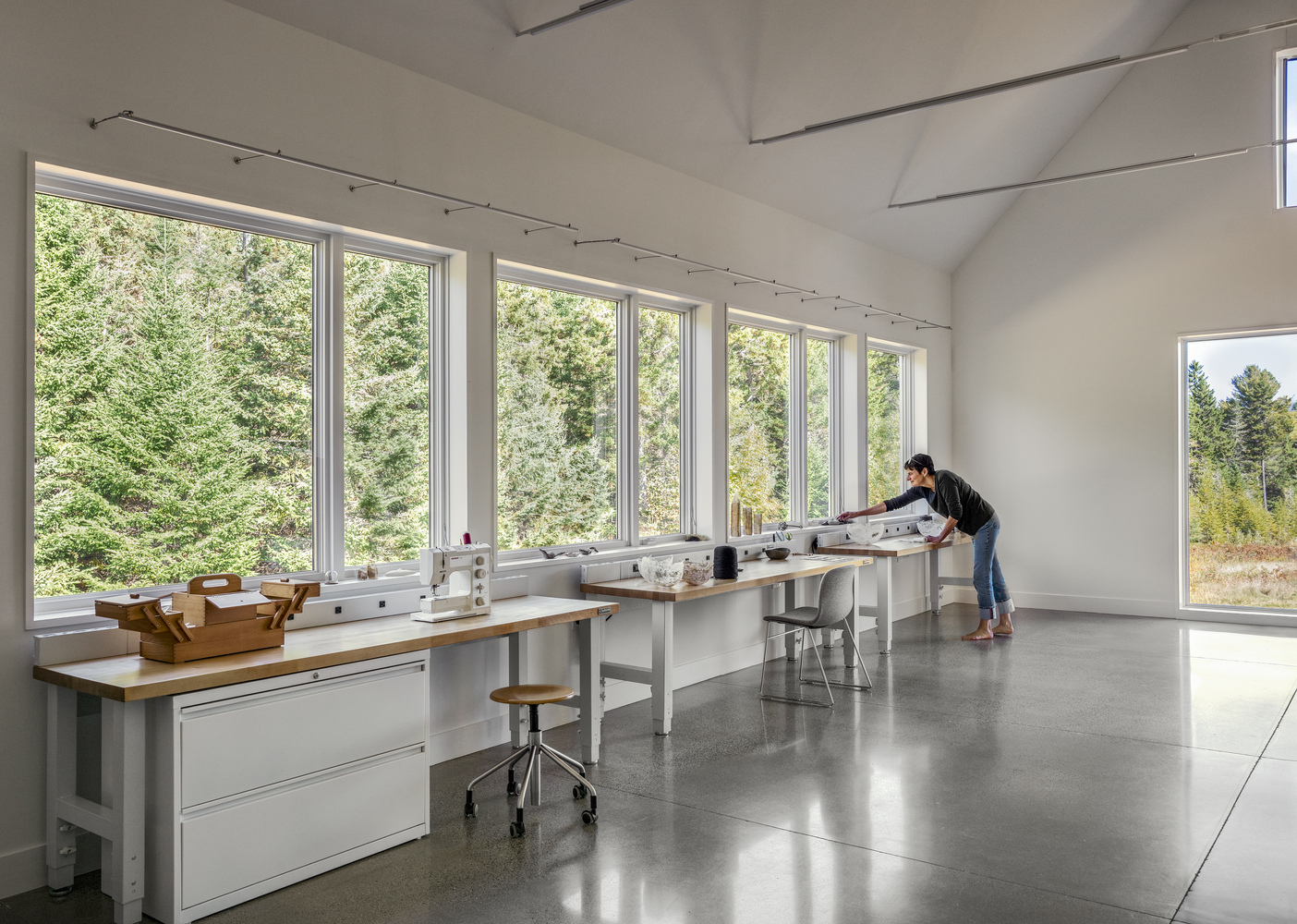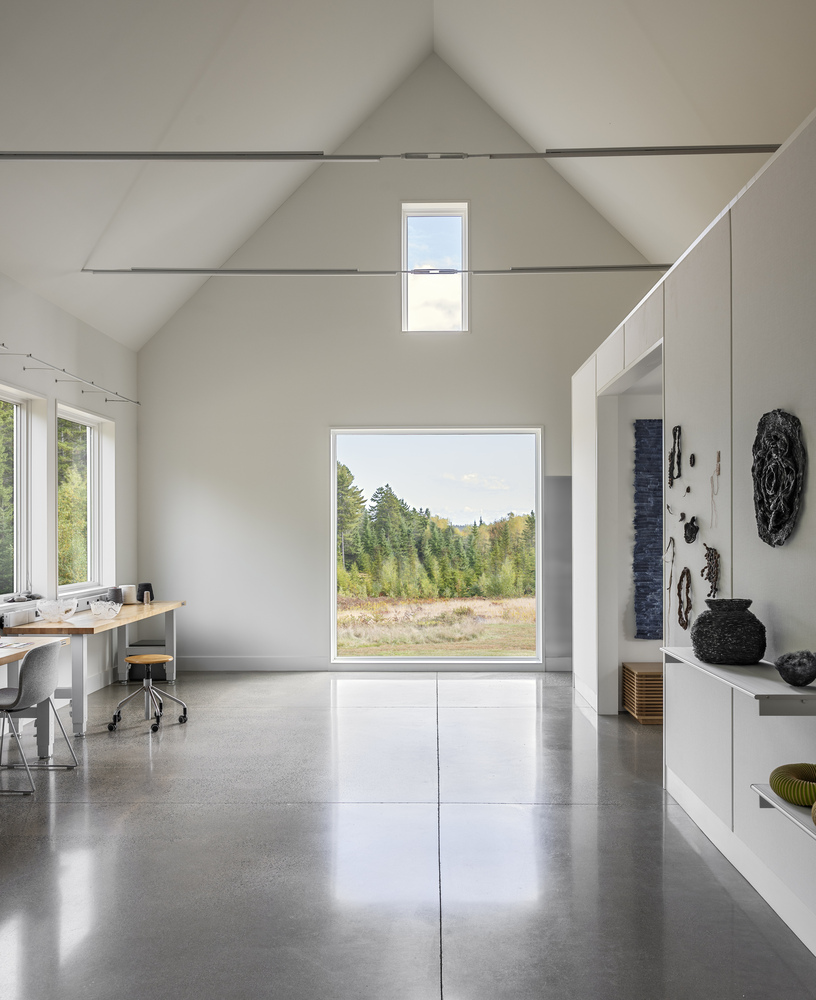 The studio faces north, providing an indirectly lit space throughout the day while framing views of the woods beyond.