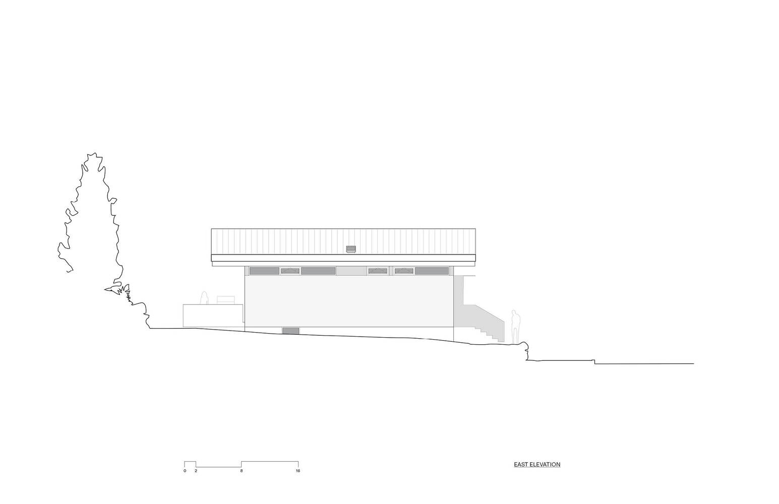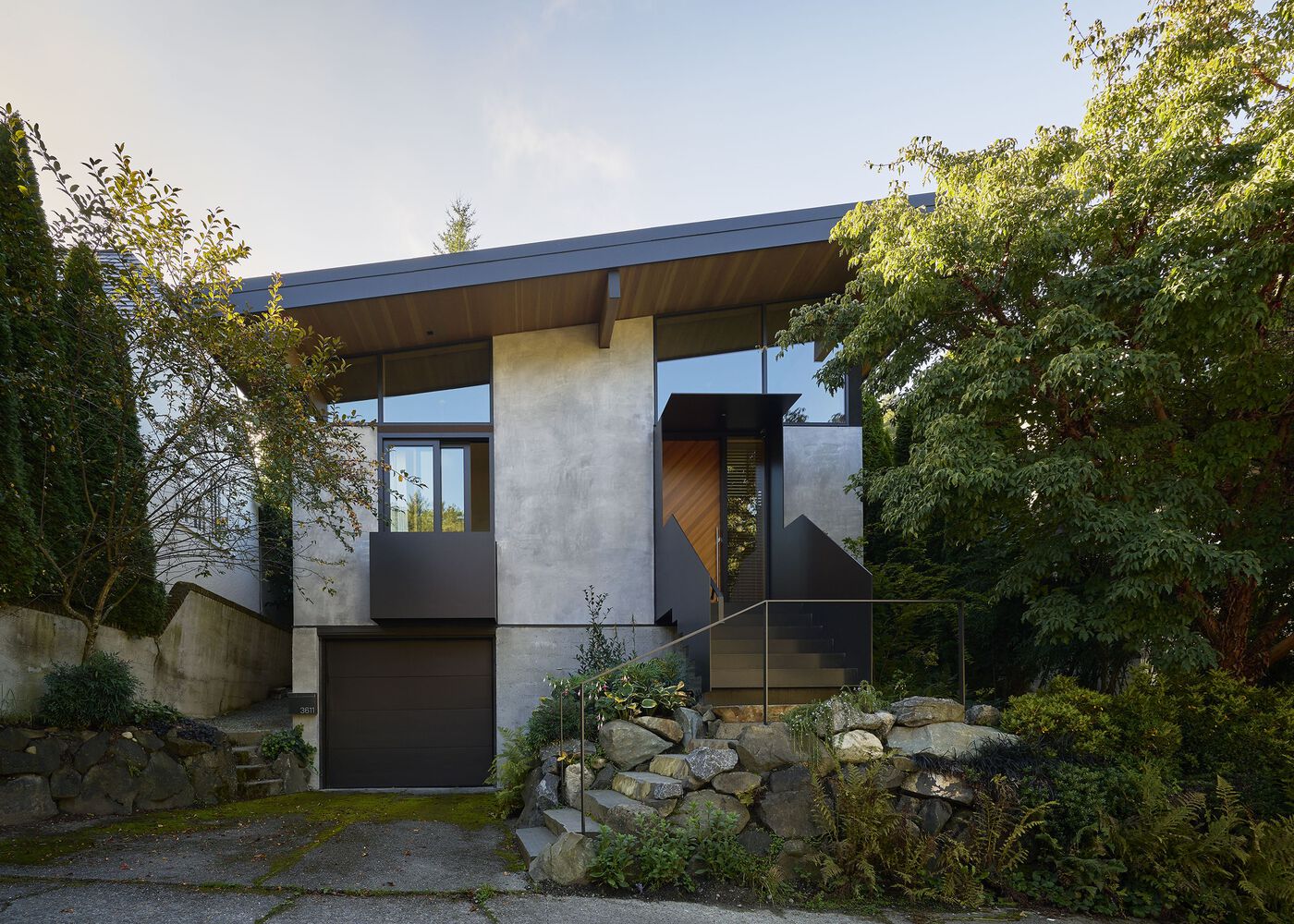On the street-facing facade, a cantilevered stair gently touches down to engage the existing rockery, as if this new main level were always there.