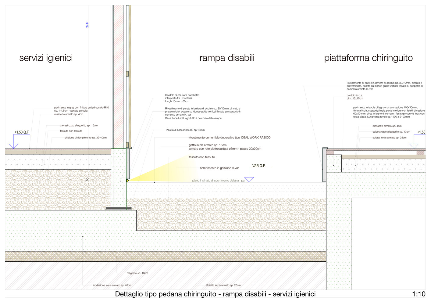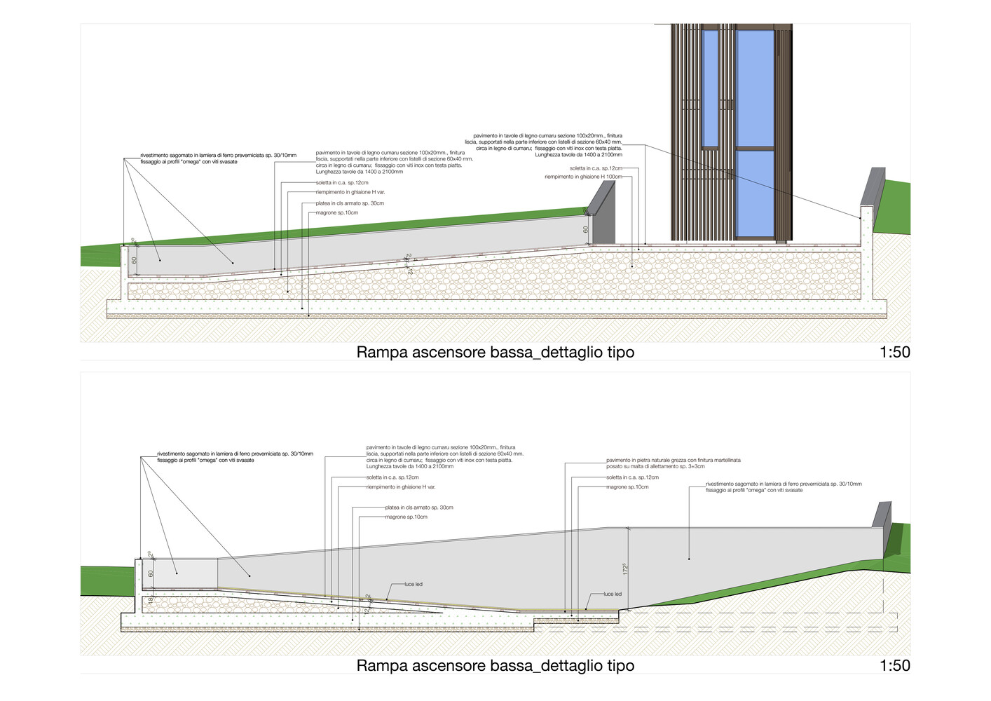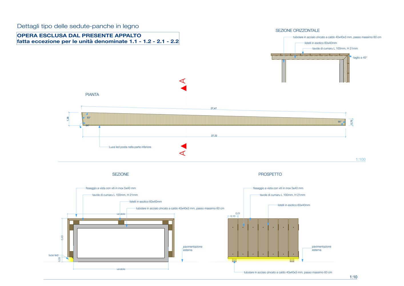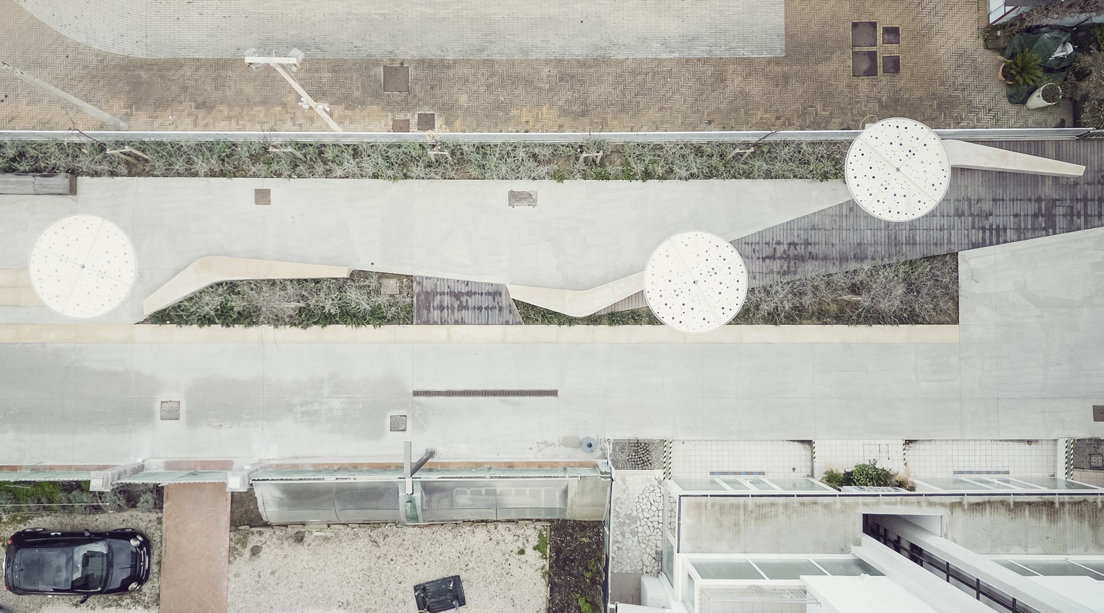 The punctuation of the furnishings, designed expressly for the specific location (seating, shade structures), discreetly accompanies the phrasing of the walk, fostering the creation of exclusive spaces of calm and relaxation, thus generating places for meeting and connecting.