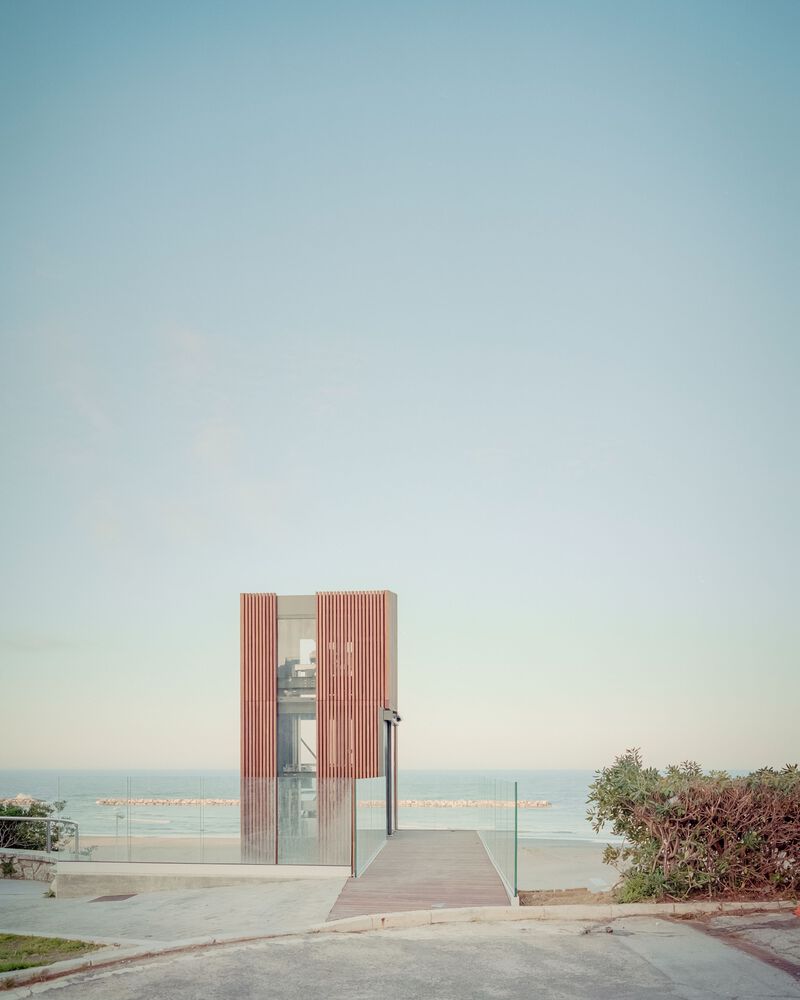 The tour concludes at the vantage point overlooking the canal harbor, with the entrance framed by iconic natural elements, defined by two specimens of pendula Sophora and the small square falling the historic staircase, which supports the new elevator shaft connecting the upper town, the beach bar, and the service building.