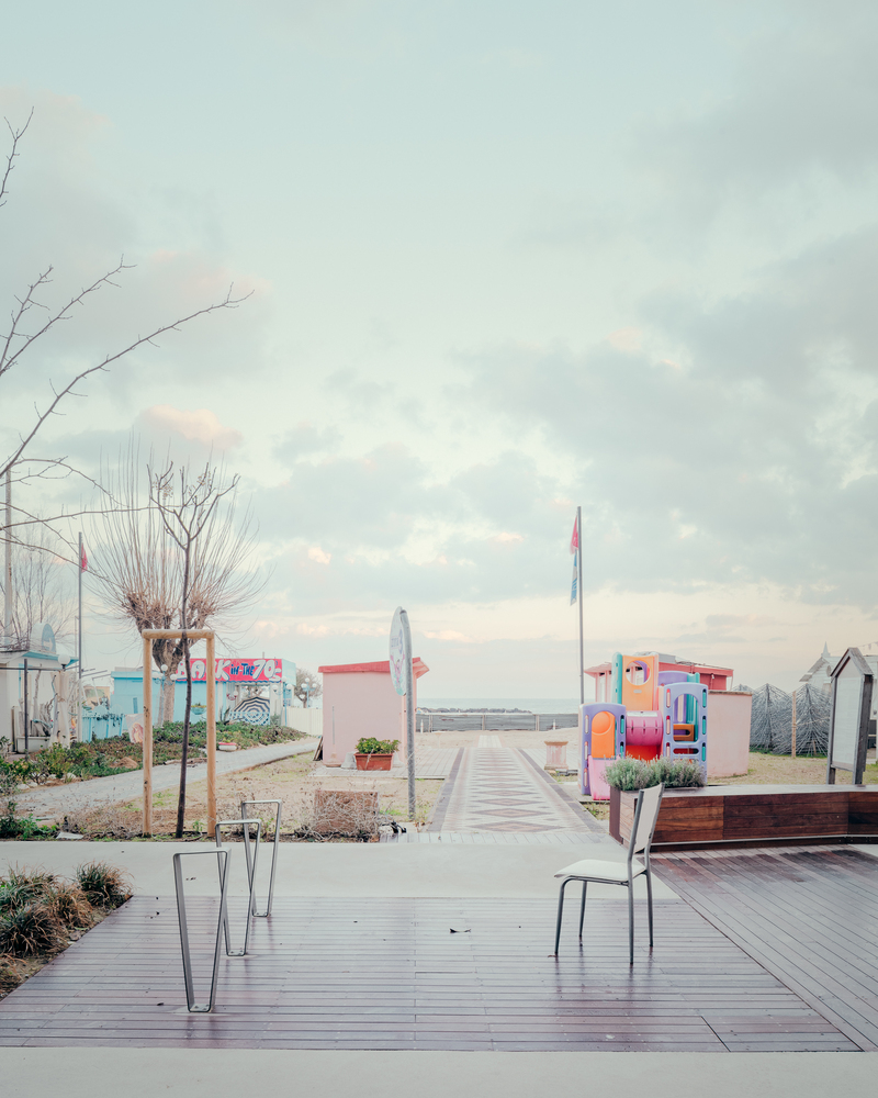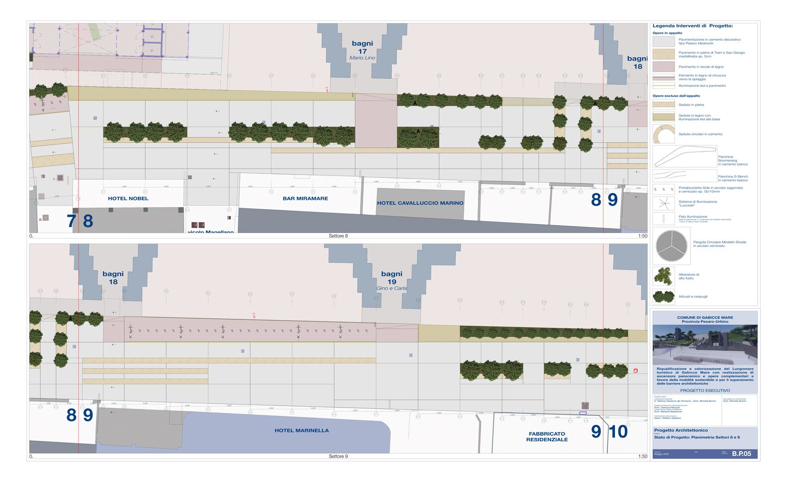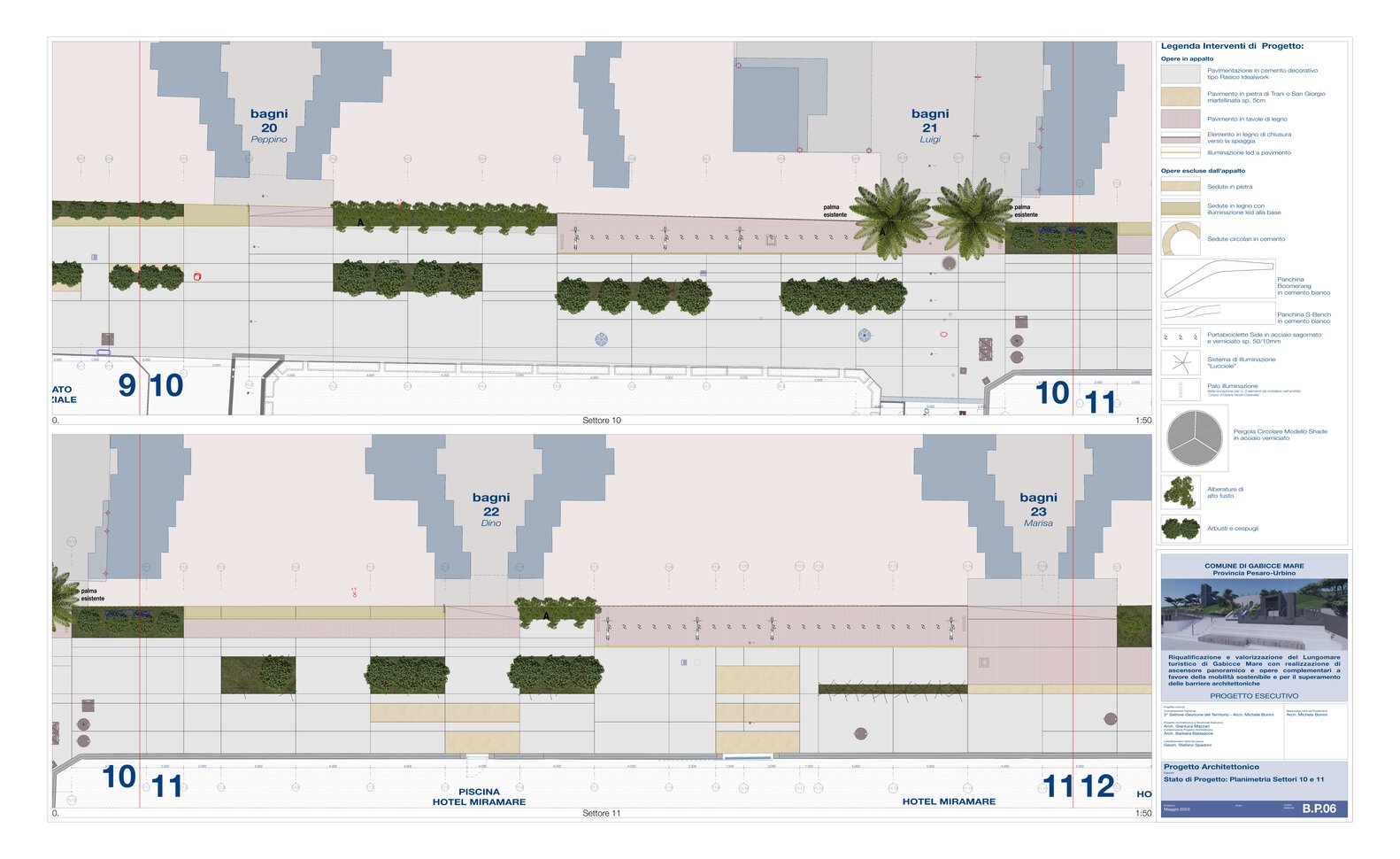 The project, which extends for approximately 600 meters, continually modifies the texture of the paving in an almost tailor-made manner, including the choice of materials, resin, stone, and wood offers the opportunity to experience and interact with a green path adjacent to the beach, composed of hundreds of tall trees and shrubs.