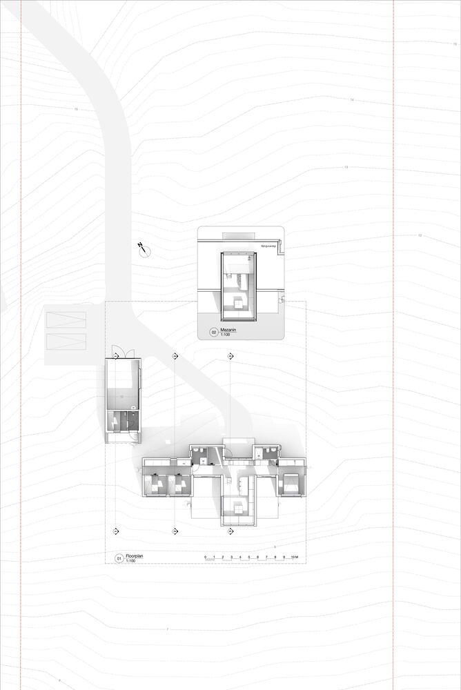 The architectural composition is organized around a long, horizontal volume aligned with the natural contour lines of the site.