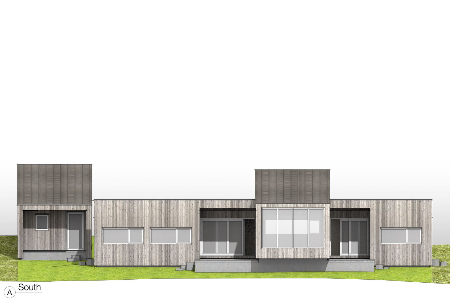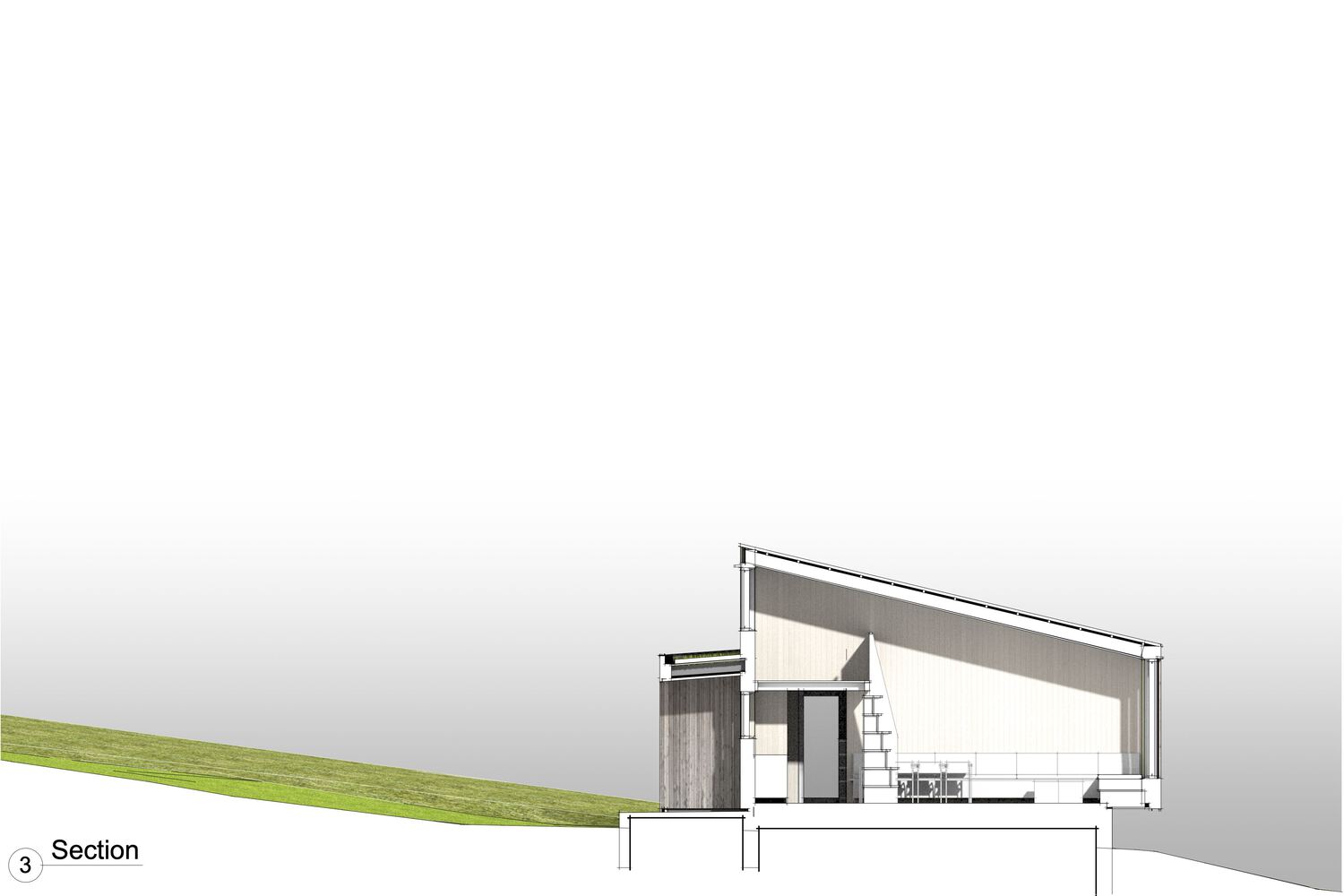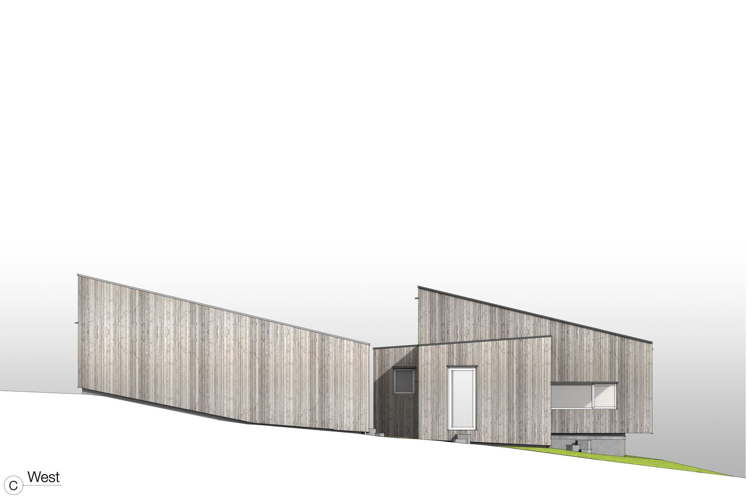 Perpendicular to this form, a taller volume with a pitched zinc roof rises as a contrasting element. A freestanding outbuilding houses a sauna and storage, also topped with zinc roofing.