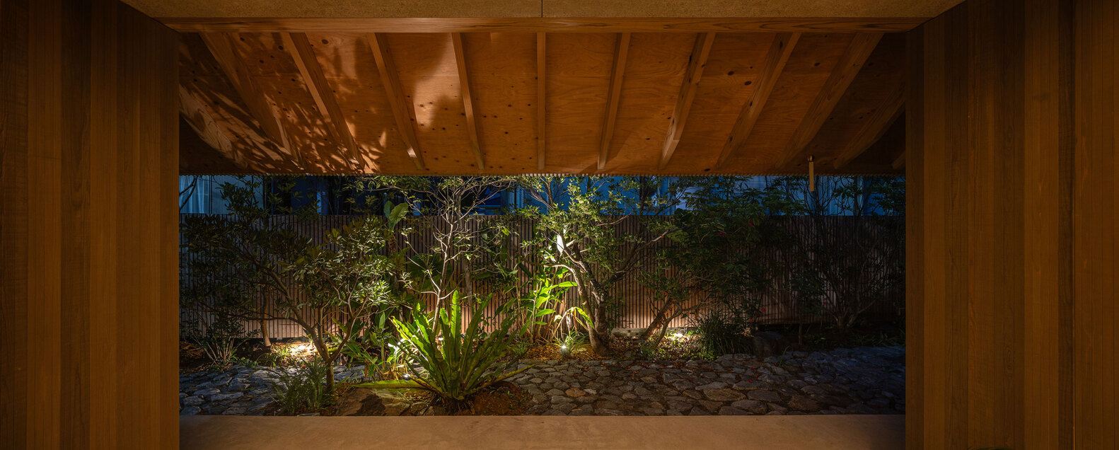 Referencing the elevated takakura(raised granary) granaries, the structure allows wind to pass freely in all directions, while deep eaves moderate intense sunlight and sudden tropical downpours.