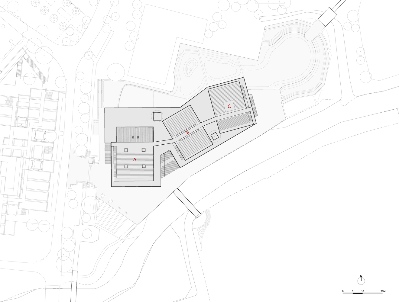 comprising three small rectangular volumes with sloping roofs that are set at a slight angle to follow the orientation of the southern riverbank.