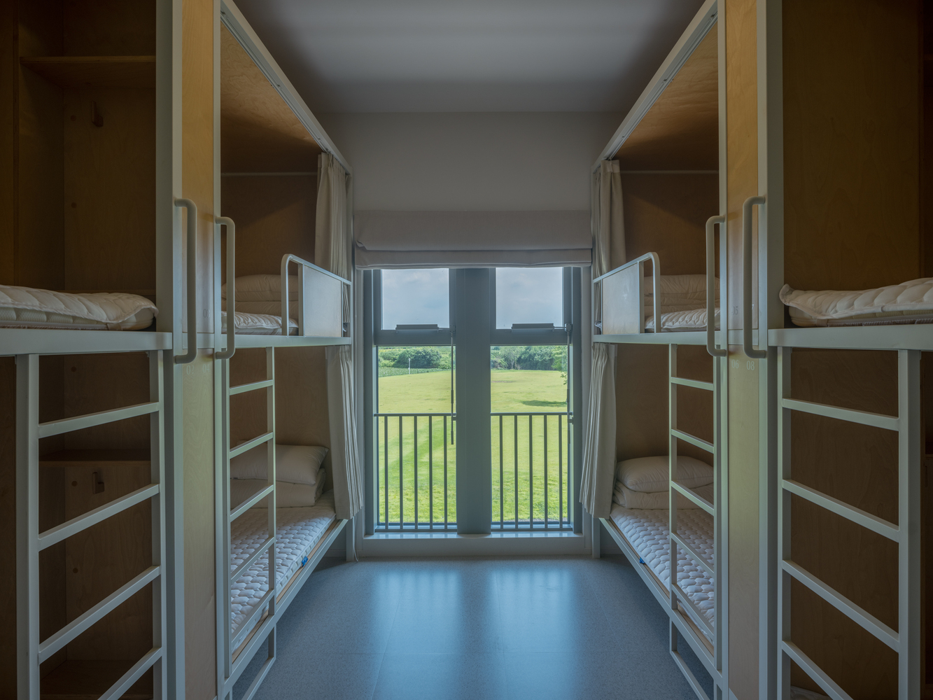 The dormitories on the second and third floors are organized around an atrium, which is connected to the first-floor public space via a staircase, promoting a sense of openness and flow.