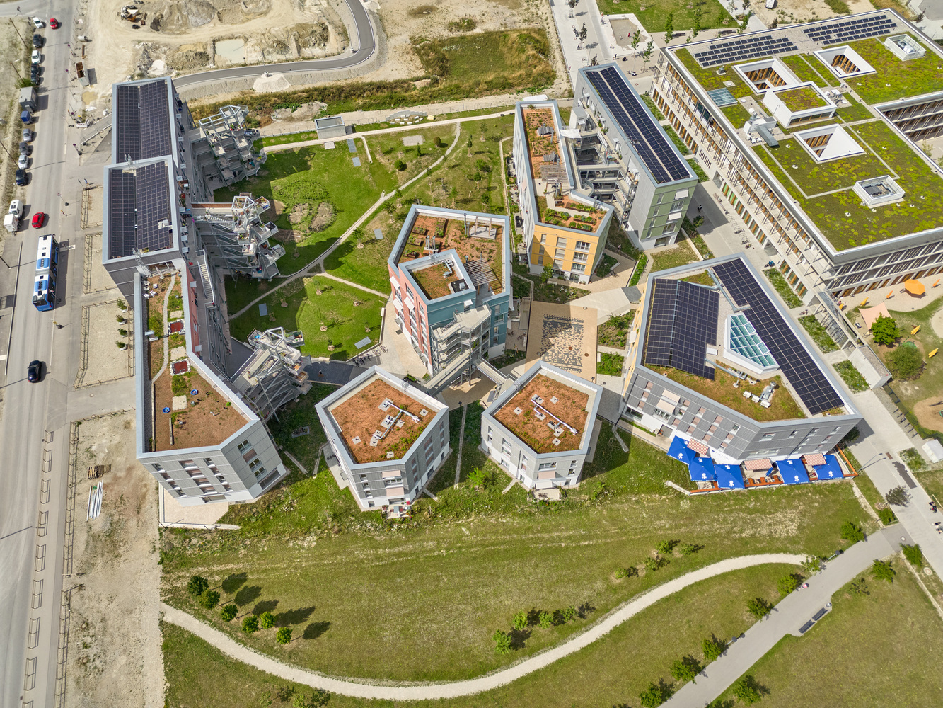 In the transition zone between city and country, on a site in Munich's Freiham urban development area, a residential project has been completed that offers rooms for different intensities of communal living—from individual apartments to housing communities with shared living rooms, and to cluster apartments.