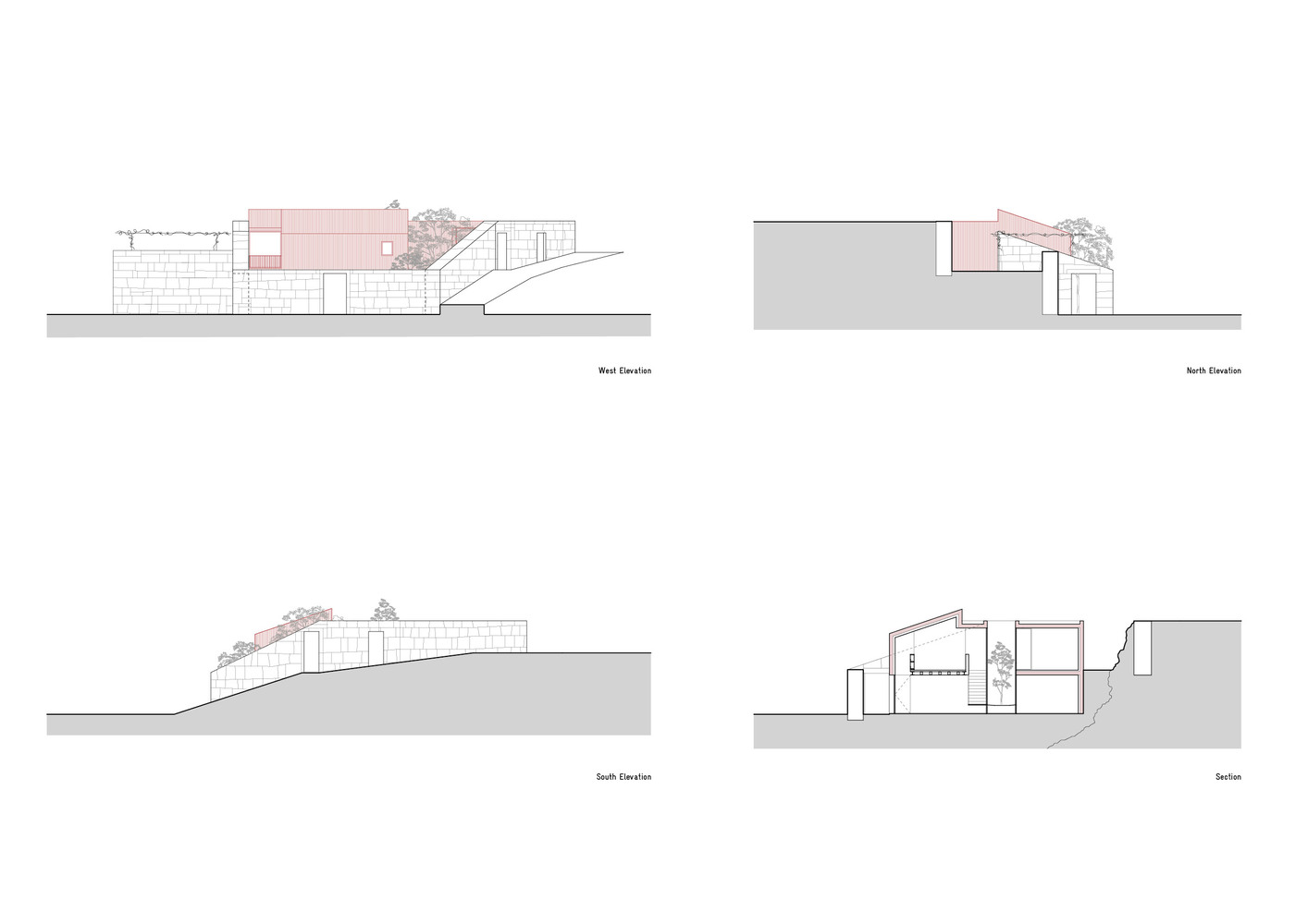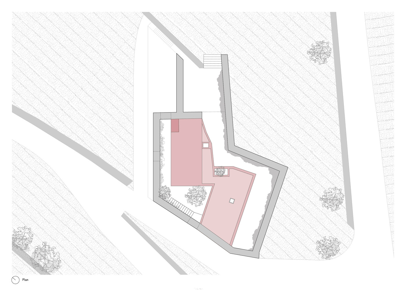 The volumes were detached from the natural boundaries, creating more enclosed spaces. The pigmented pink concrete establishes a new relationship with the surroundings.
