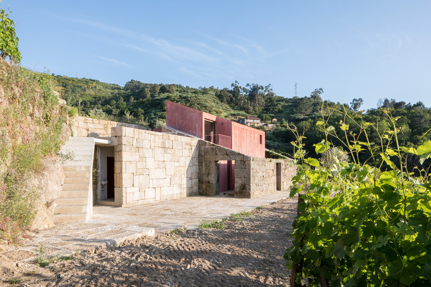 The use of this color belongs to the chromatic tradition of many surrounding architectures, complementing the green of the vineyard.