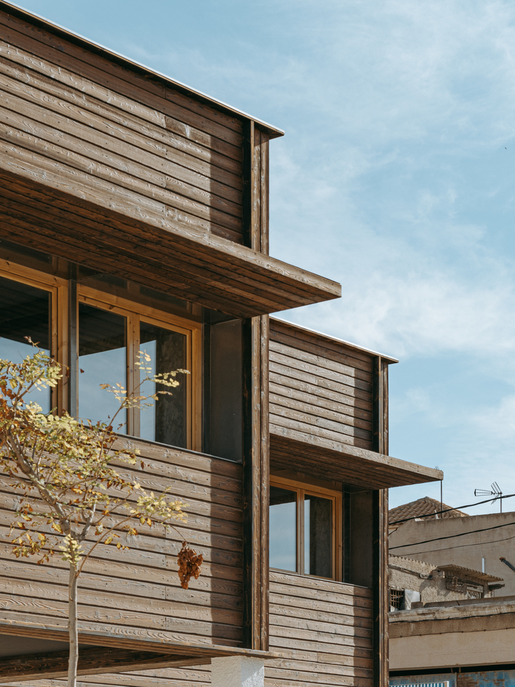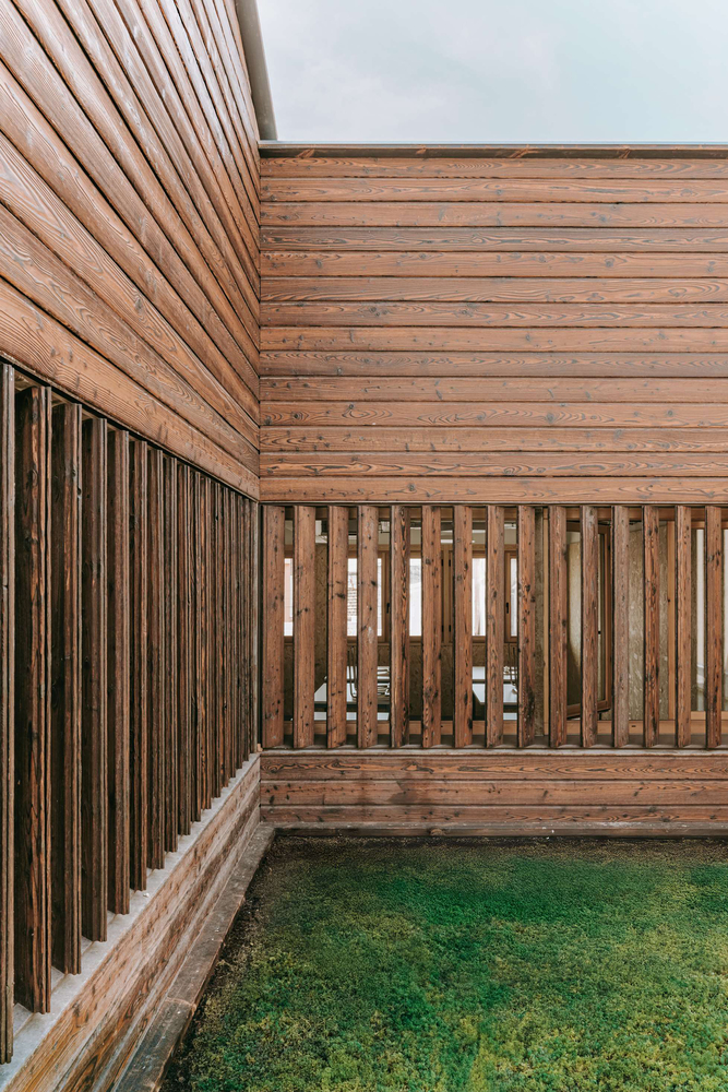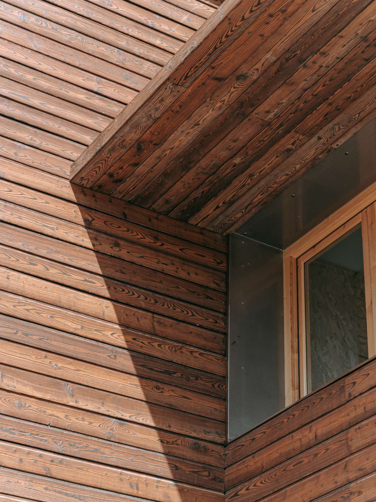 The most significant intervention was the addition of a new ventilated wooden façade — a pine "animal print" that wraps the entire first floor.