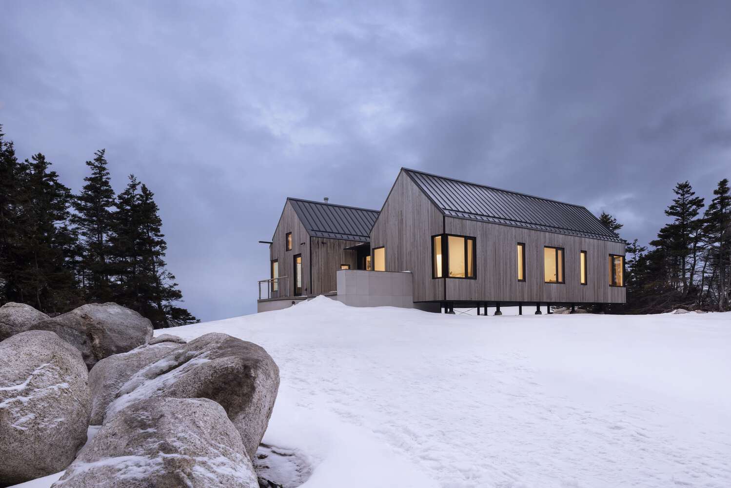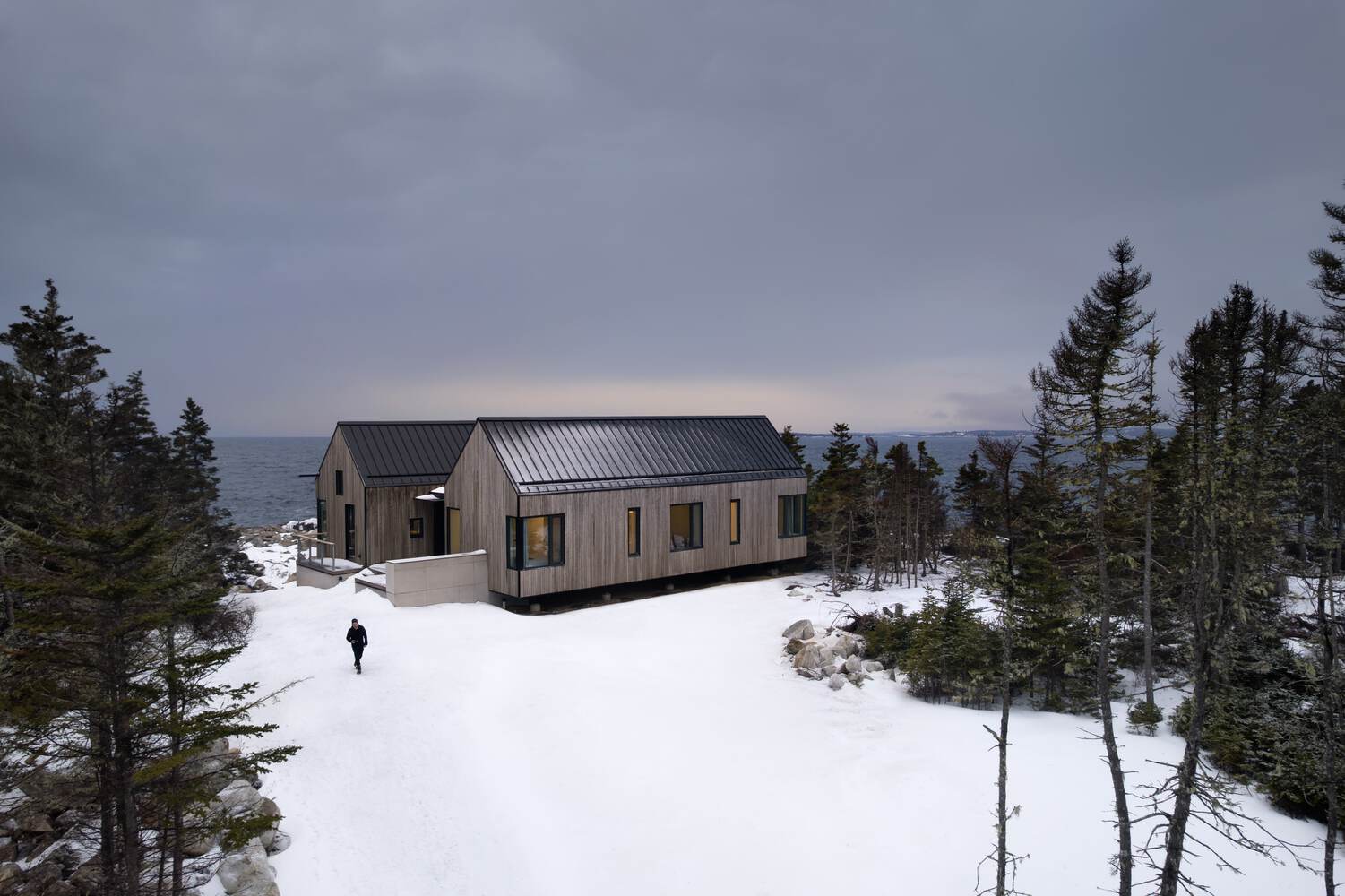 Along the coastal landscape of Nova Scotia, two imposing gables rise, embodying conformity between built structure and the wild, untamed beauty of the maritime coast.