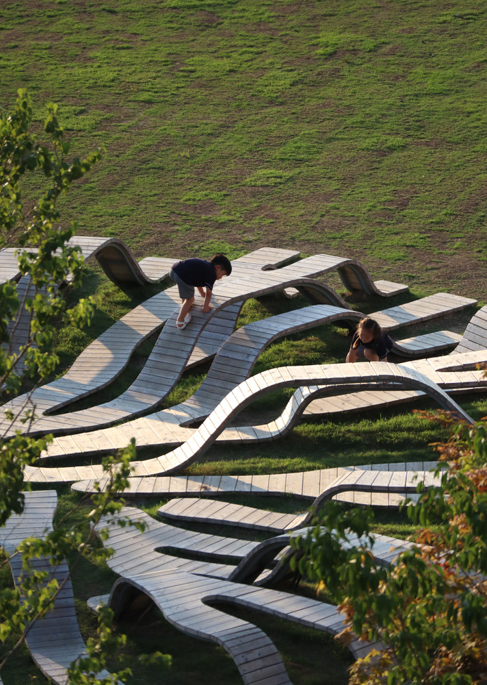 The curves rise at varying heights calibrated to the human scale, transforming into functional furniture such as benches, tables, and stages.