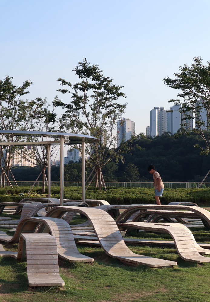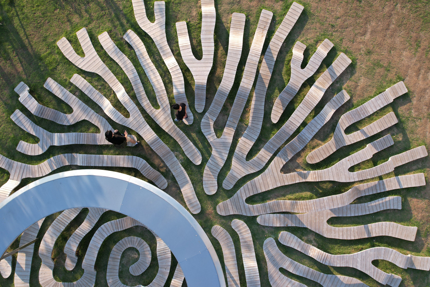 Structurally, the installation combines a metal framework with white-treated silicate wood decking, whose bright tone contrasts vividly against the surrounding greenery and riverside landscape, further emphasizing the flowing curvature.