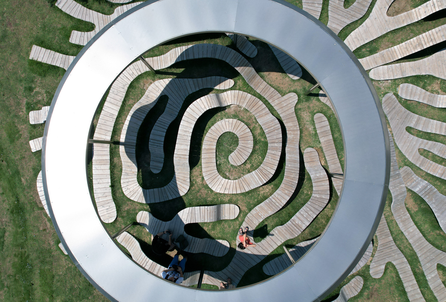 Its stainless steel surface reflects the ground pattern, merging upper and lower realms, nature and artificiality, the real and the mirrored.