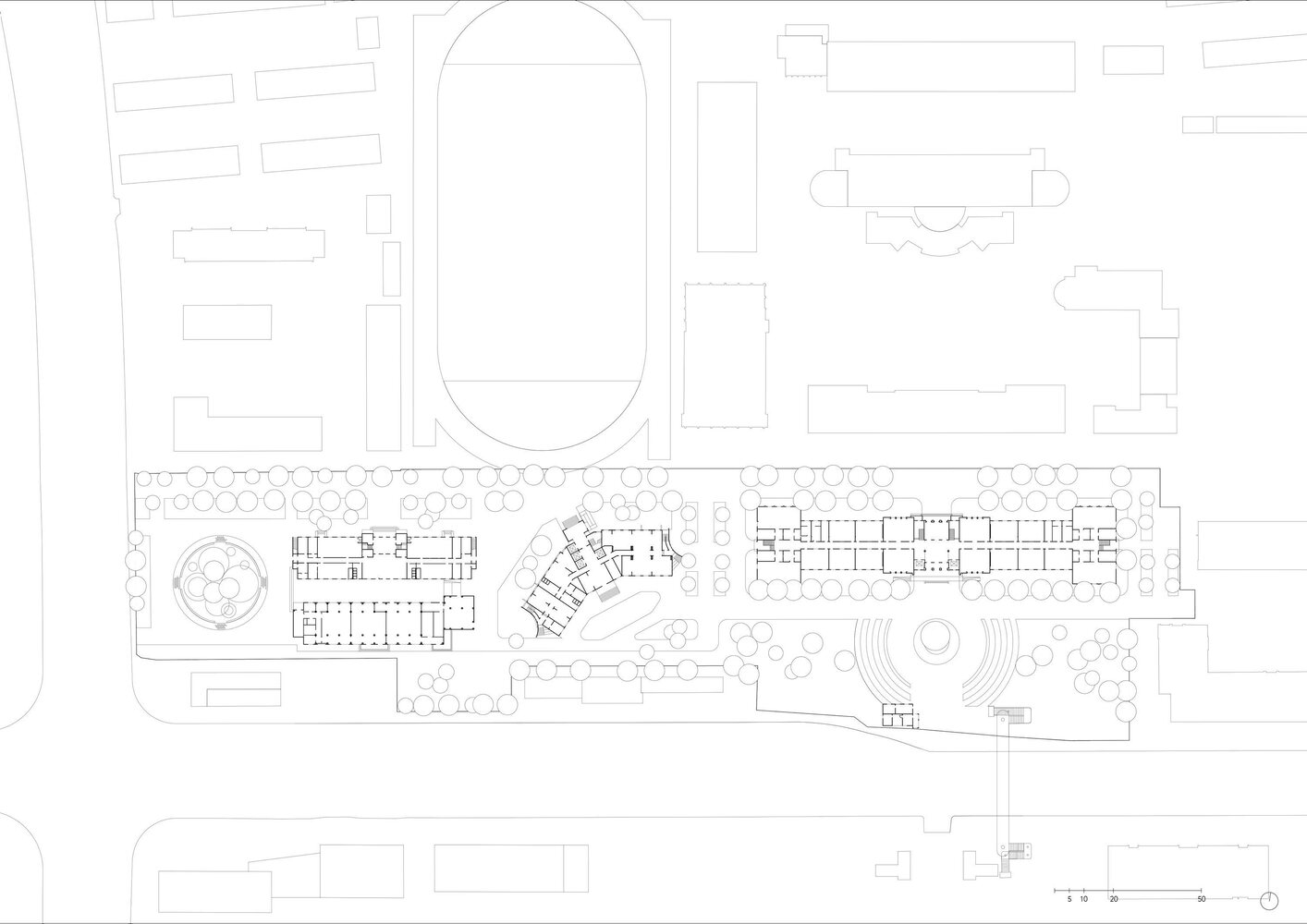 Built in the 1950s, 1980s, and 1990s, the structures varied widely in style and scale. gmp's concept unites these disparate elements into a harmonious ensemble, taking cues from the classical modernism of the earliest buildings. Today, the complex provides learning and living space for around 1,000 students.