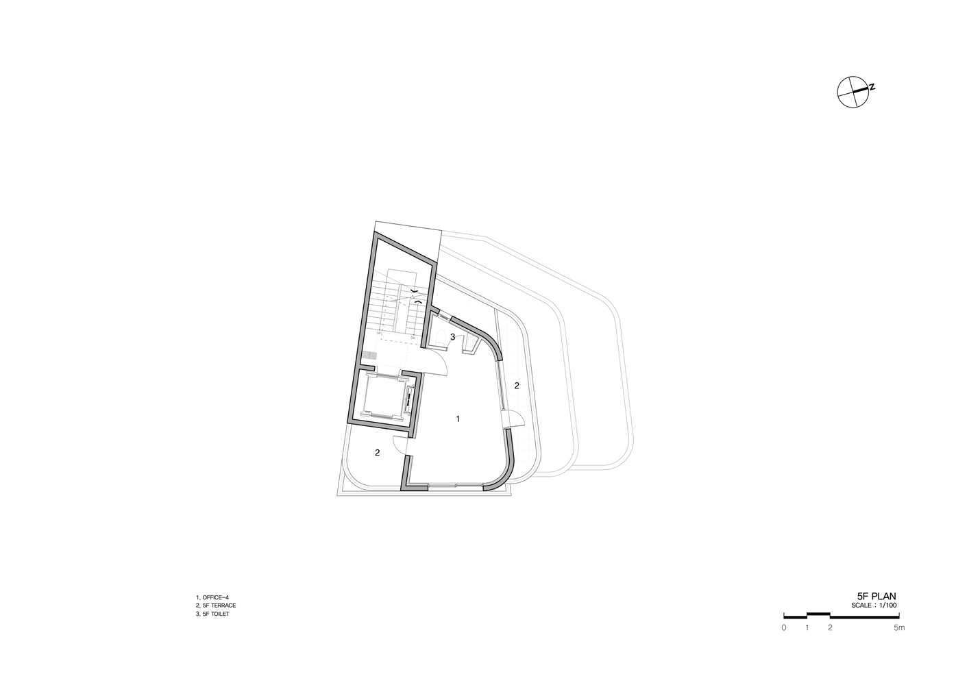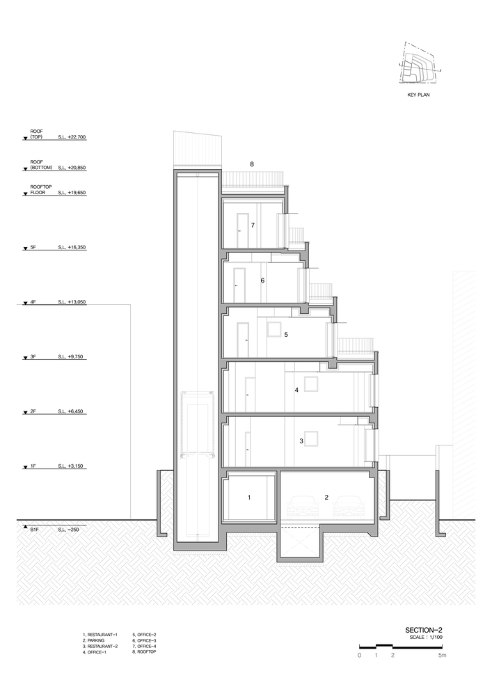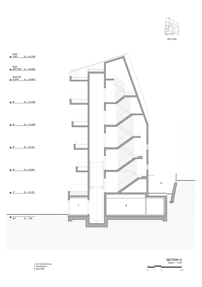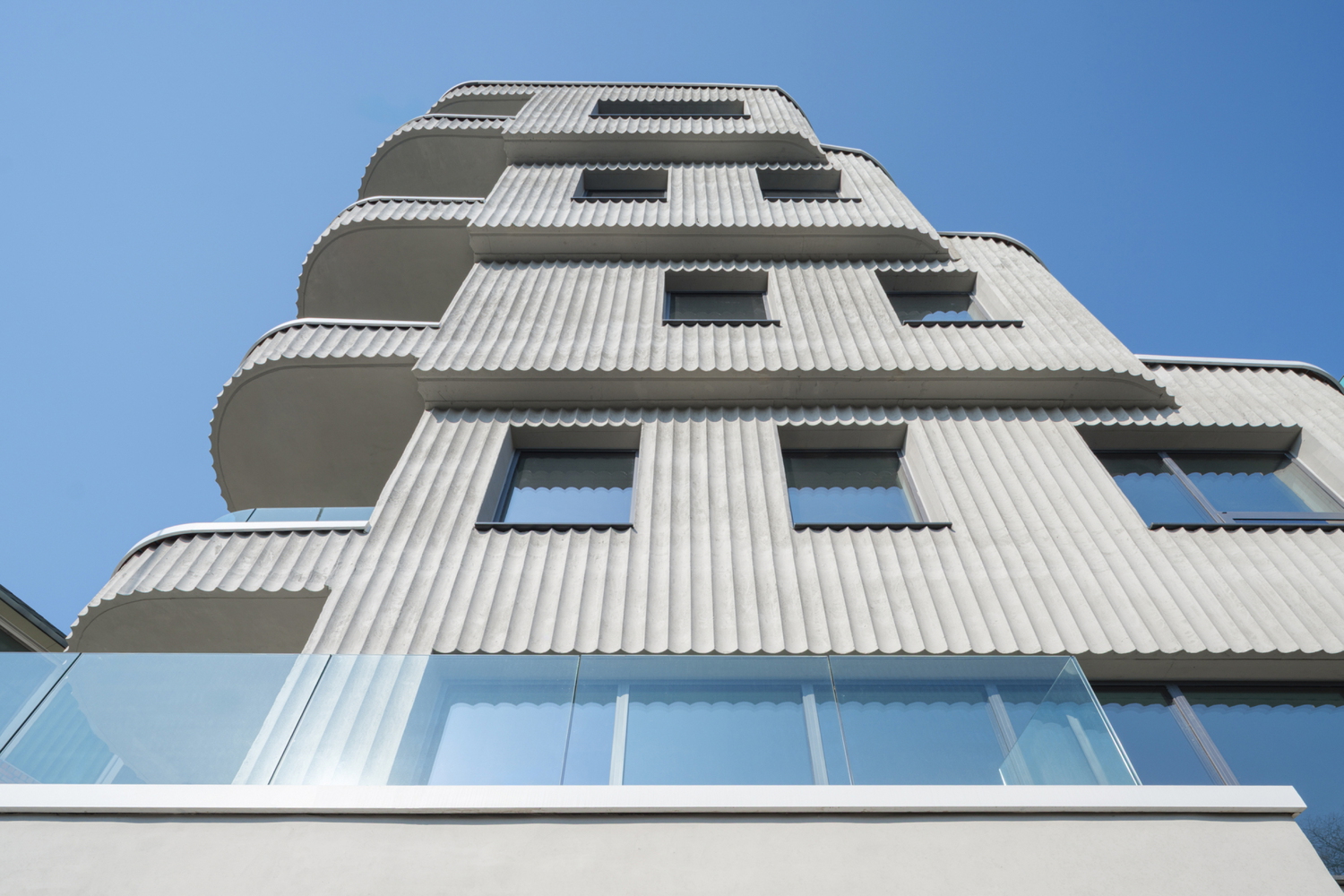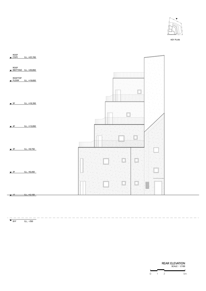 To make the required set-back—which is not visible from the front—perceptible from the main road, we applied a design where the masses gradually project forward from the 3rd floor upwards.