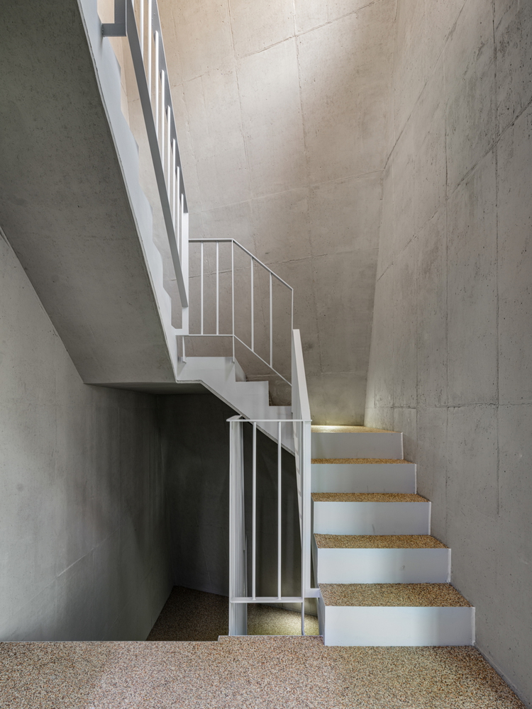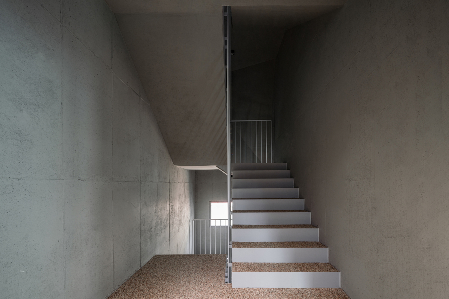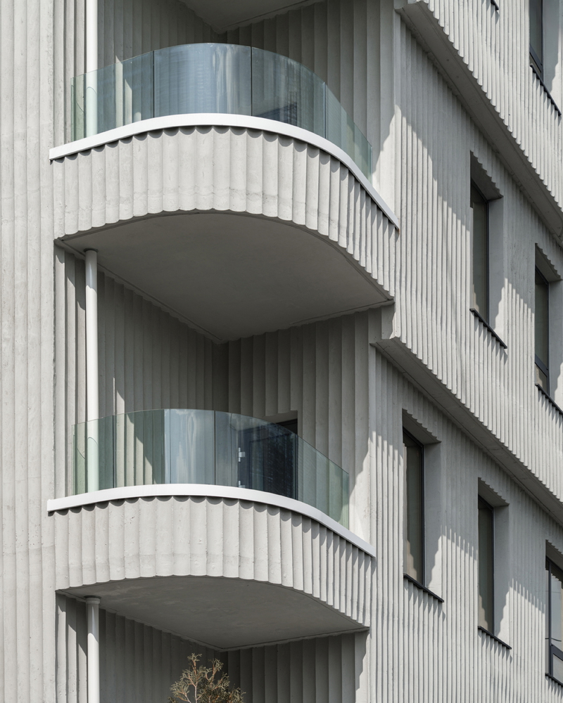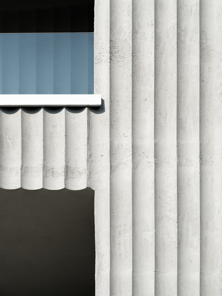 To express a form that seemed carved from a massive, solid rock emerging from the bedrock, we decided to use an exposed concrete texture combined with a vertical pattern etched onto its surface.