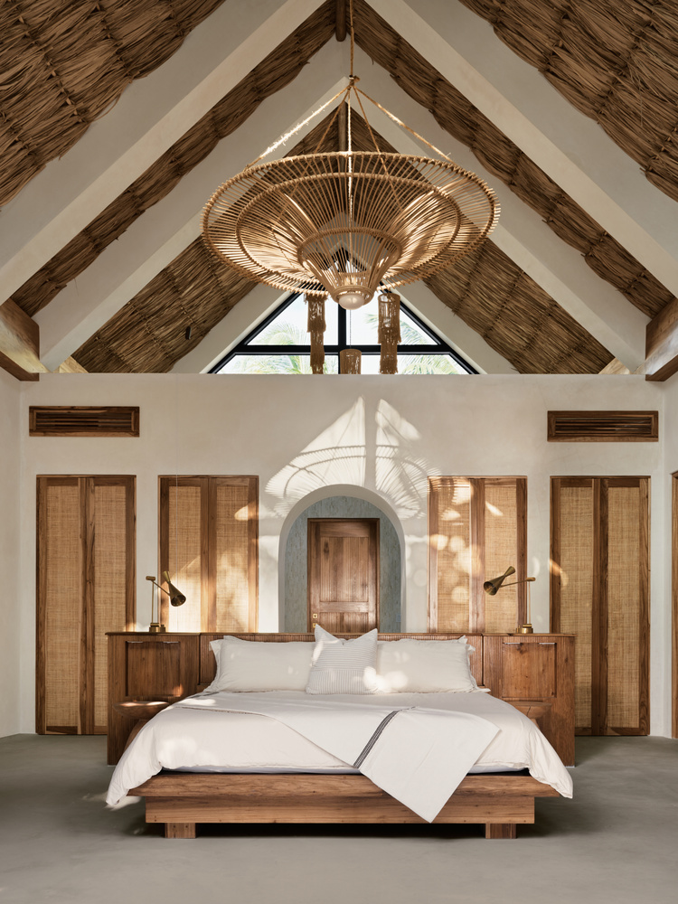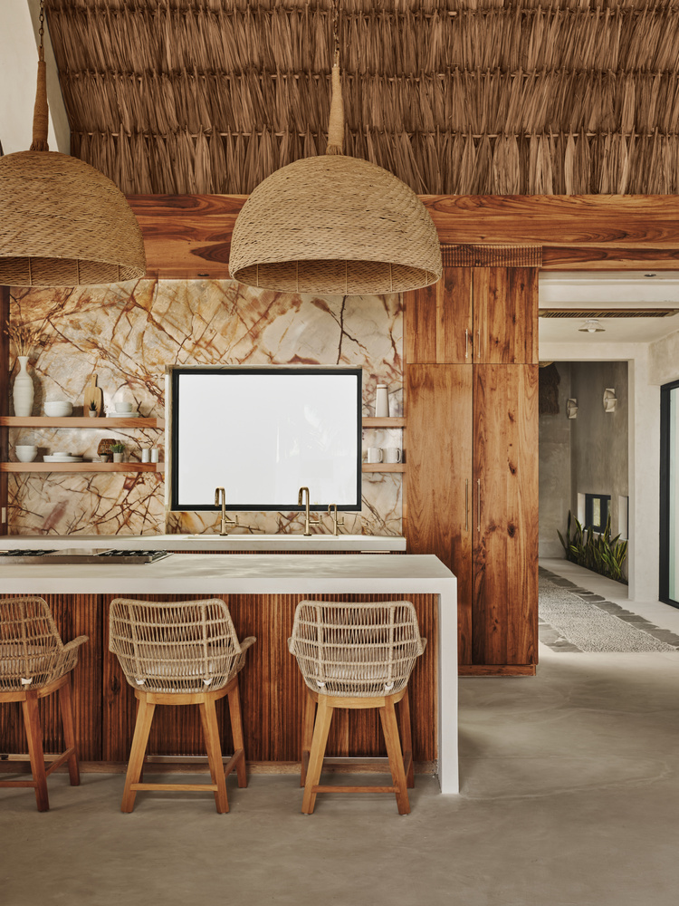 Traditional Mayan Chukum plaster keeps interiors cool, while local Sam wood cabinetry, custom reeded detailing, and handcrafted banana fiber pendants infuse the spaces with tactile beauty.