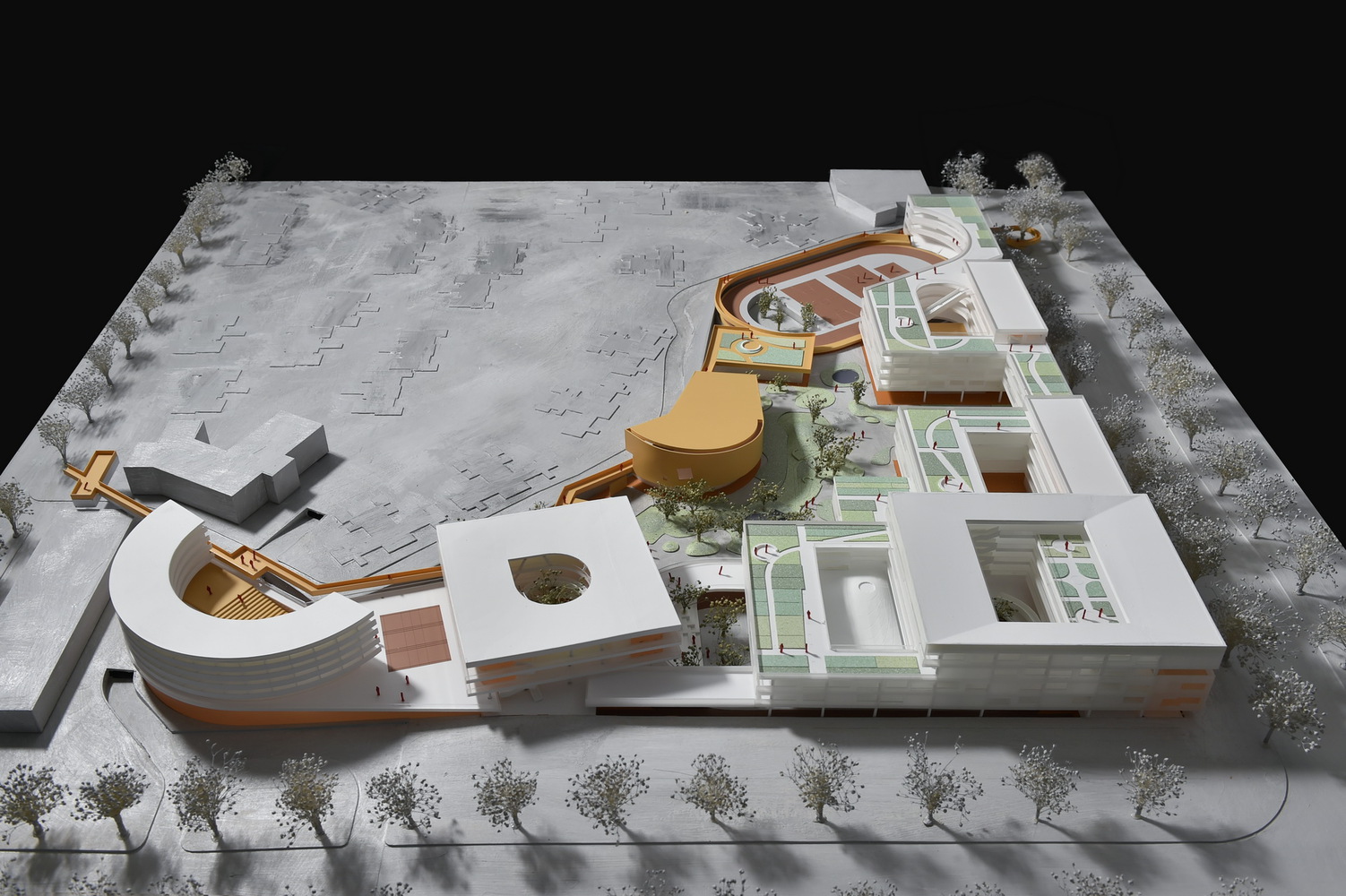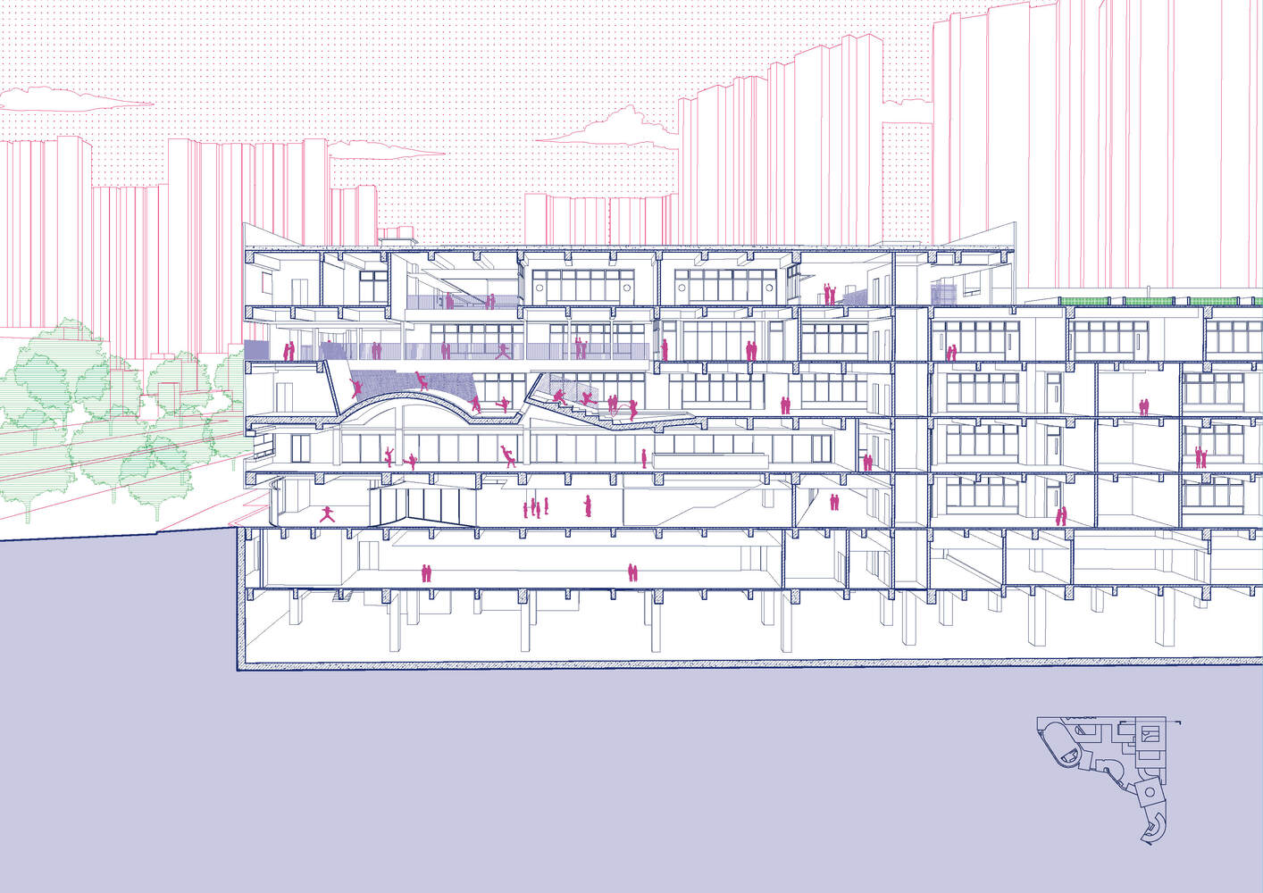 Along its perimeter, density is layered into a continuous enclosing mass allowing the school's interior to open into garden-like courtyards reminiscent of Lingnan Landscape.