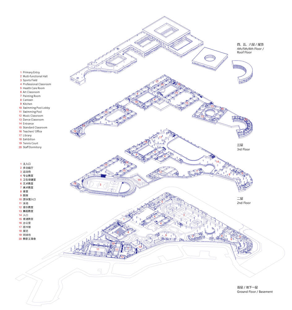 Shared functional spaces line the site edges, with colonnaded ground-floor street frontage opened to the city and corridors extended to the community, forming a composite interface between the school and the neighborhood.