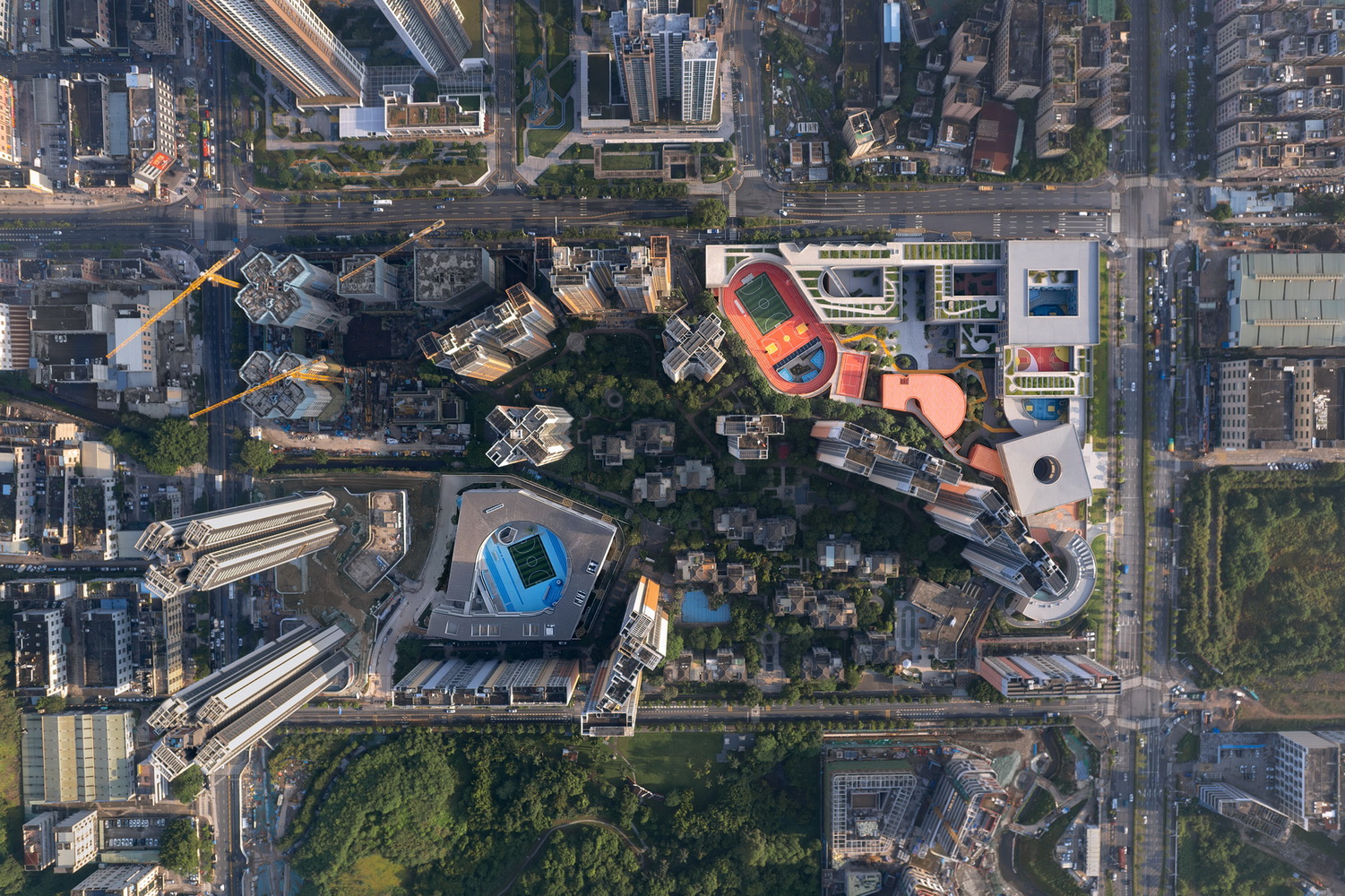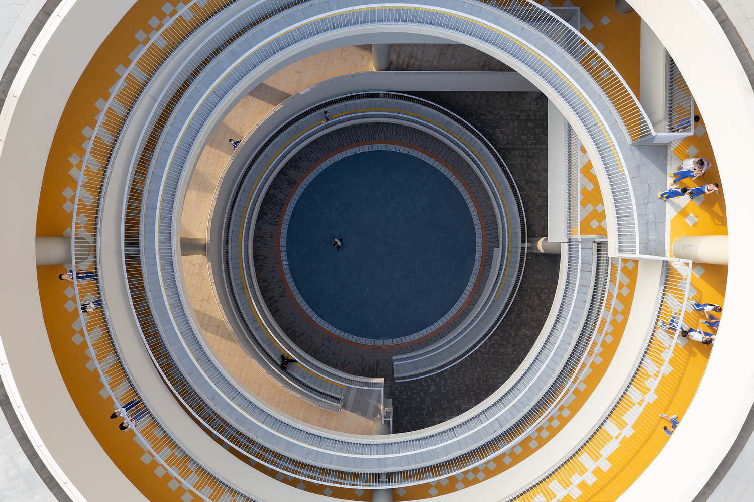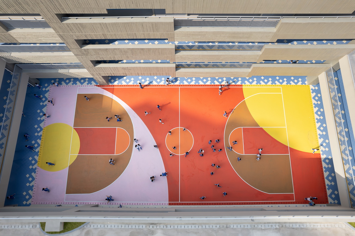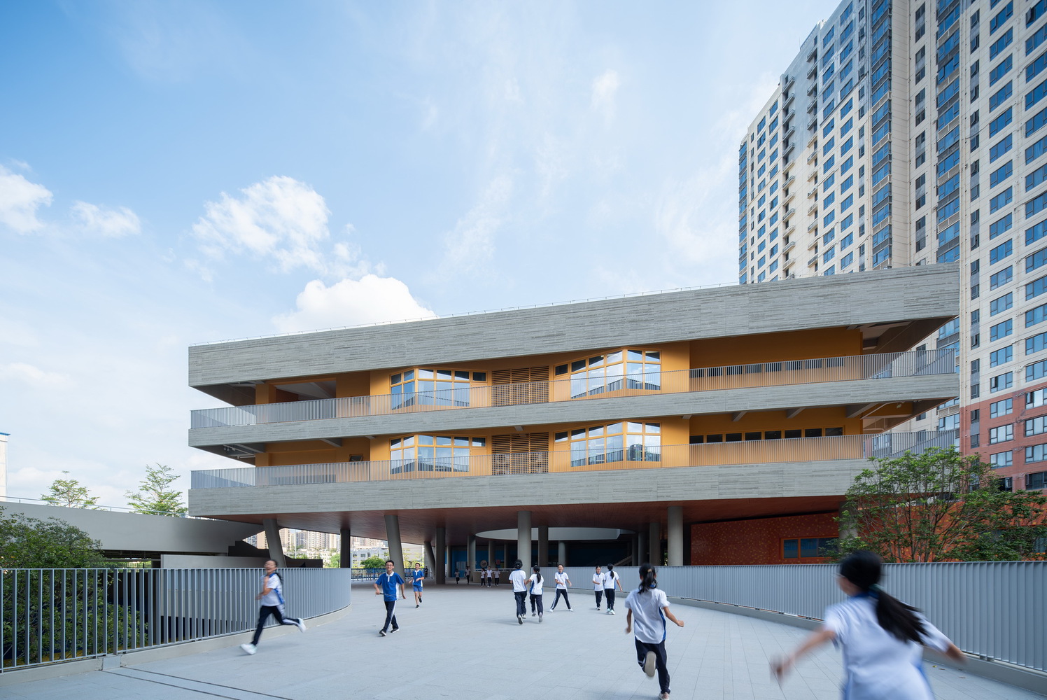 For younger children, circular ramps and playful passages encourage exploration; for middle years, expansive color-blocked courts invite running and free movement; for older students, cloistered garden and greenery cultivate a quieter rhythm balancing concentration and dialogue.