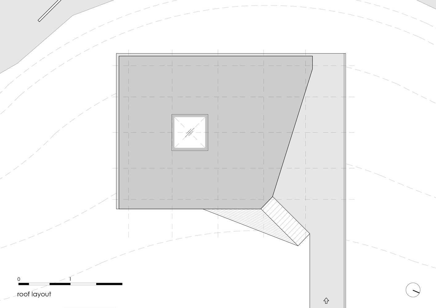 A central skylight opening filters natural light into the heart of the pavilion, creating moments where light meets texture in striking ways.