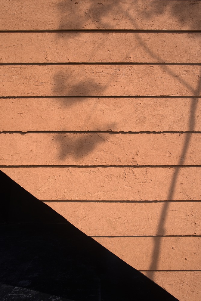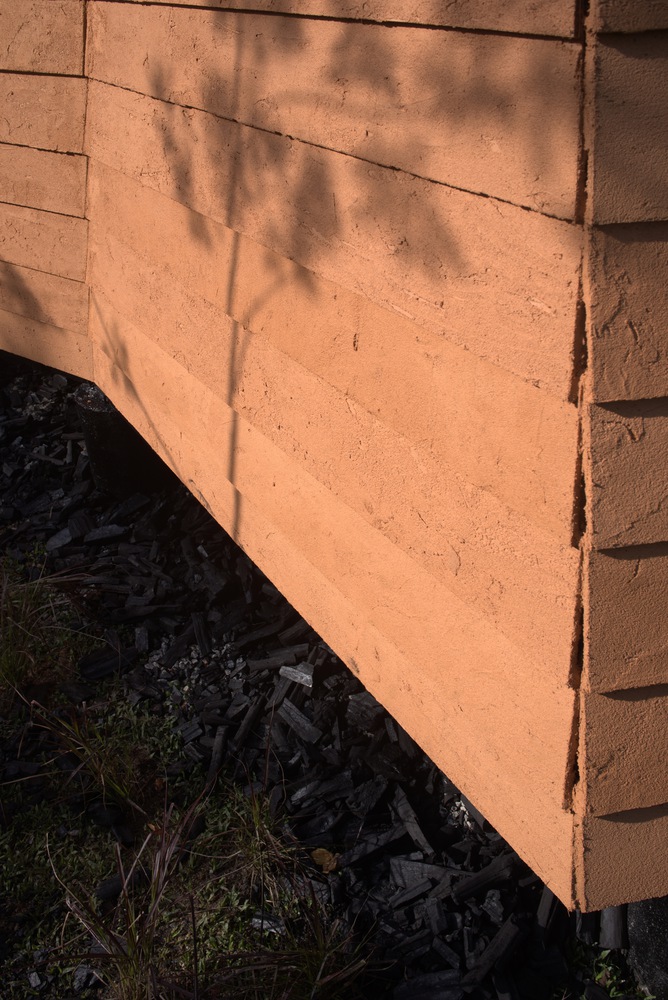 The pyramid-like inner space was built as an insert within the frame, and carefully lined with the burnt timber, while the outer skin, timber boards cladded with clay plaster, were applied in a way that gives rhythm and tactility to the facade.