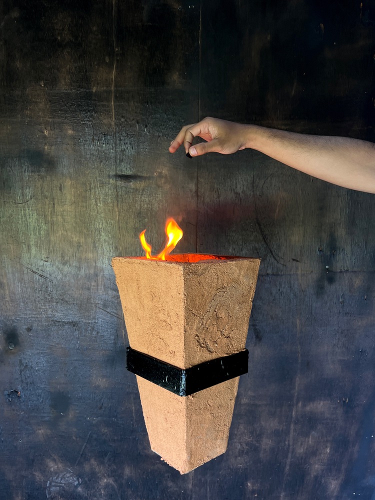 Formed through folded geometries and pyramid-like planes, the structure stands as both altar and vessel. Made of sand, clay, timber, and fire, it breathes with elemental presence.