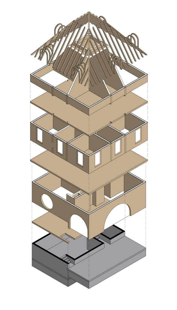The compact, almost square basic shape with a tent roof picks up on familiar proportions, but develops an independent presence as a solitary structure.