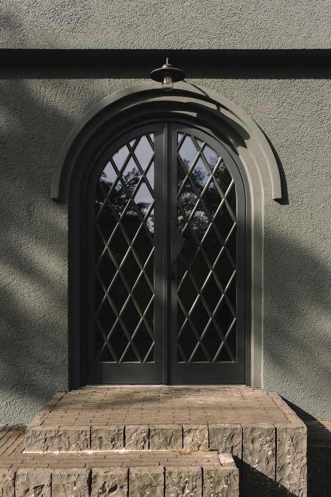 This is structured with a diamond-shaped glazing bar. A design element that is continued in the inner, floor-to-ceiling sliding doors.