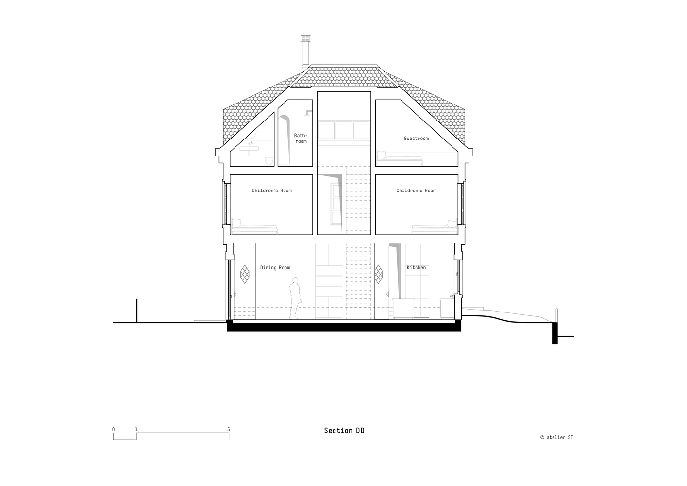 The upper stories house bedrooms, children's rooms, and work areas - all flexibly usable, flooded with natural light, and with views of the garden and the treetops.